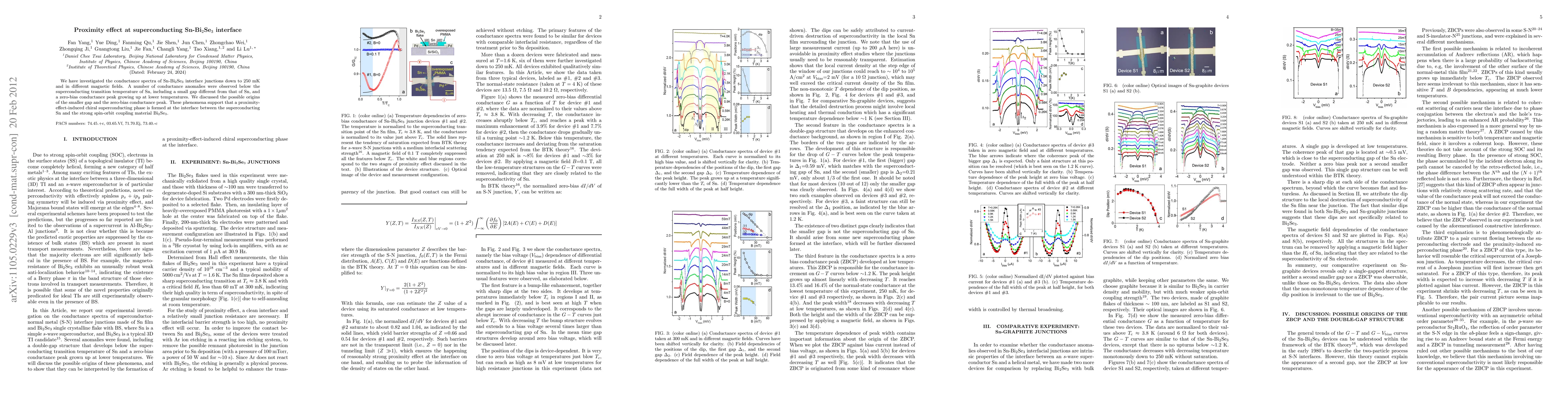 The paper presents detailed experimental analysis of conductance spectra at the Sn-Bi2Se3 interface, revealing novel features attributed to a proximity-induced chiral superconducting phase.