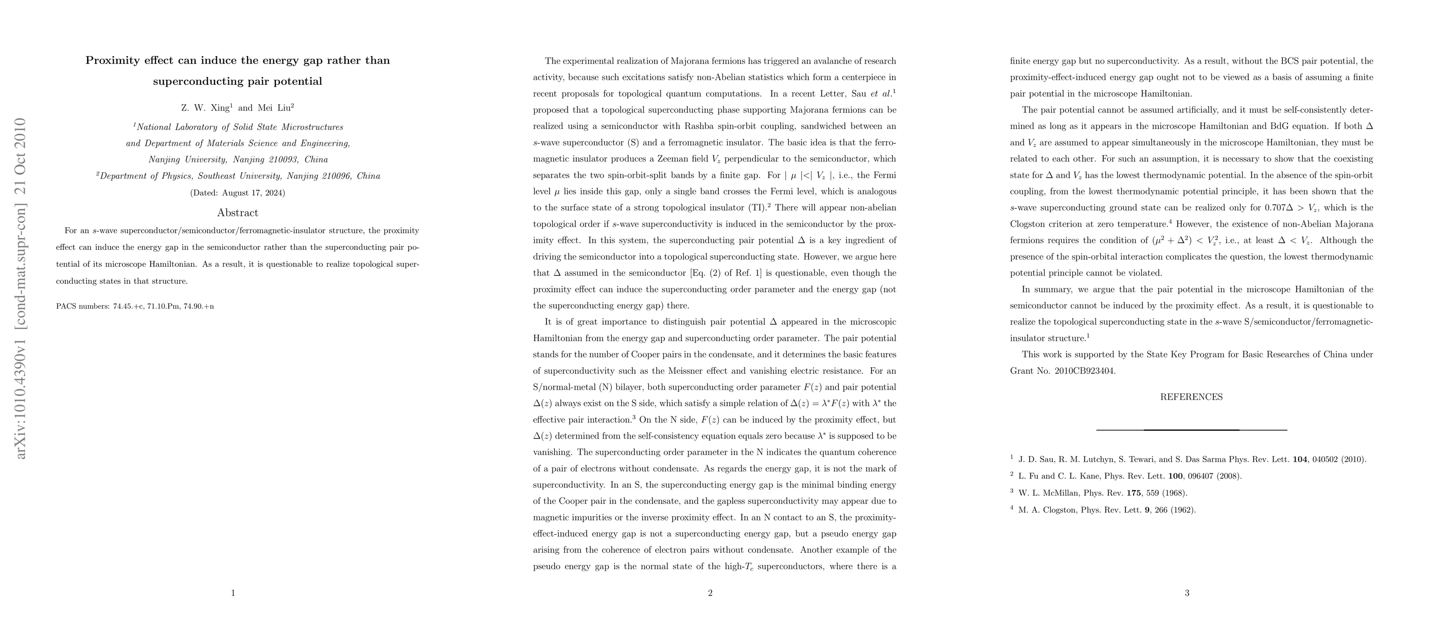 For an s-wave superconductor/semiconductor/ferromagnetic-insulator structure, the proximity effect can induce the energy gap in the semiconductor rather than the superconducting pair potential of its microscope Hamiltonian. As a result, it is questionable to realize topological superconducting states in that structure.