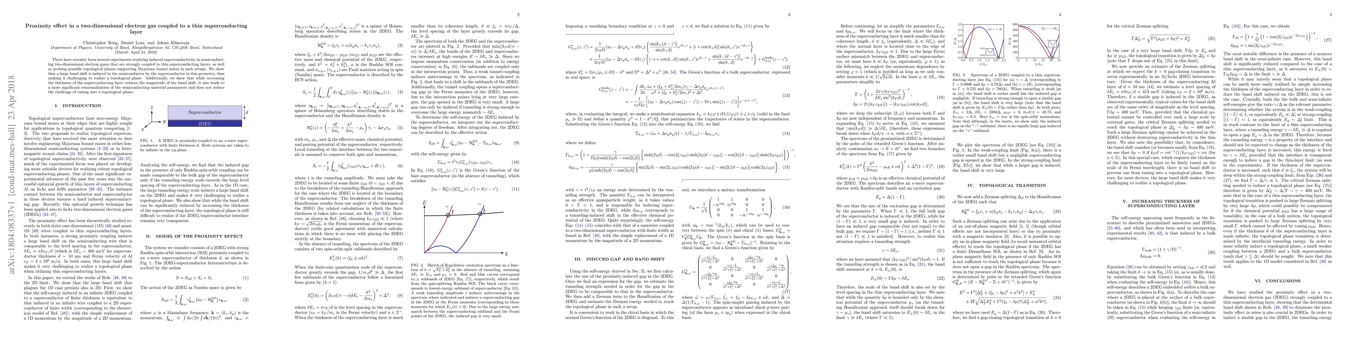 There have recently been several experiments studying induced superconductivity in semiconducting two-dimensional electron gases that are strongly coupled to thin superconducting layers, as well as probing possible topological phases supporting Majorana bound states in such setups. We show that a large band shift is induced in the semiconductor by the superconductor in this geometry, thus making it challenging to realize a topological phase. Additionally, we show that while increasing the thickness of the superconducting layer reduces the magnitude of the band shift, it also leads to a more significant renormalization of the semiconducting material parameters and does not reduce the challenge of tuning into a topological phase.