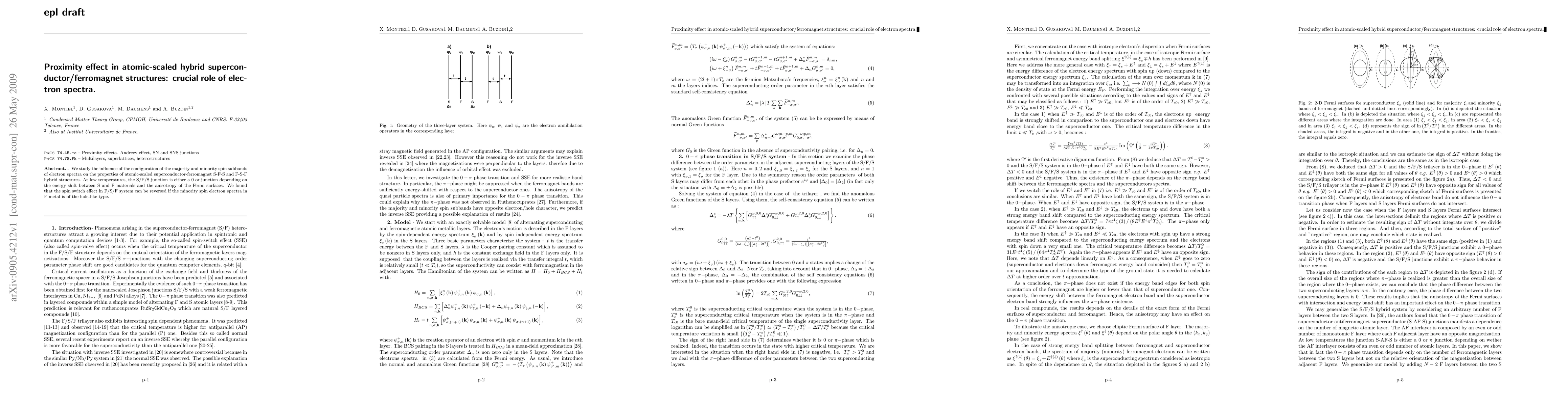 We study the influence of the configuration of the majority and minority spin subbands of electron spectra on the properties of atomic-scaled superconductor-ferromagnet S-F-S and F-S-F hybrid structures. At low temperatures, the S/F/S junction is either a 0 or junction depending on the energy shift between S and F materials and the anisotropy of the Fermi surfaces. We found that the spin switch effect in F/S/F system can be reversed if the minority spin electron spectra in F metal is of the hole-like type.