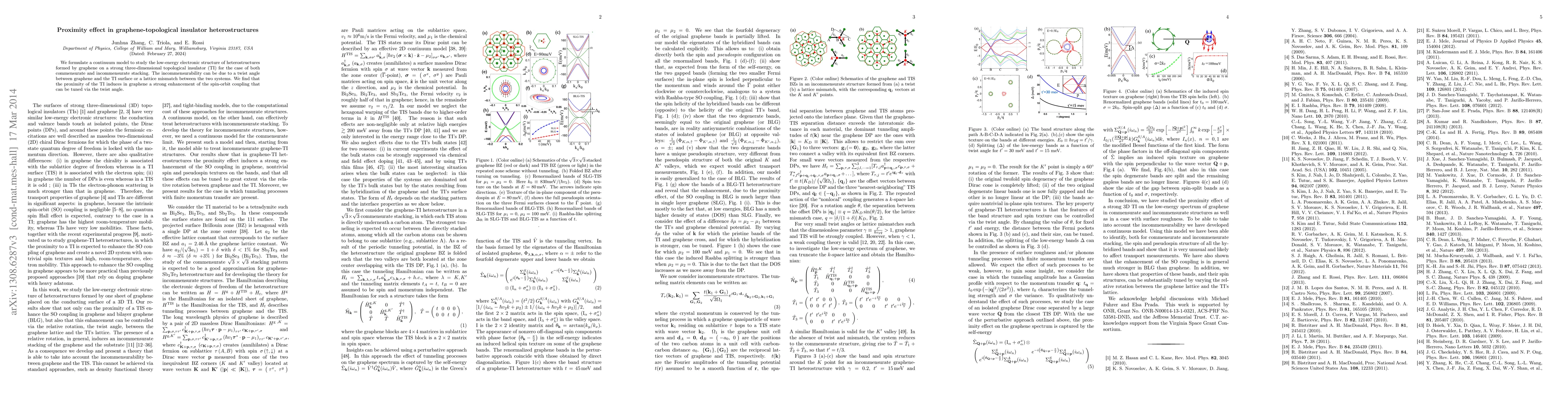 This paper develops a continuum model to analyze the electronic structure in graphene-topological insulator heterostructures, finding that proximity to the TI significantly enhances graphene's spin-orbit coupling, which can be controlled by adjusting the twist angle.