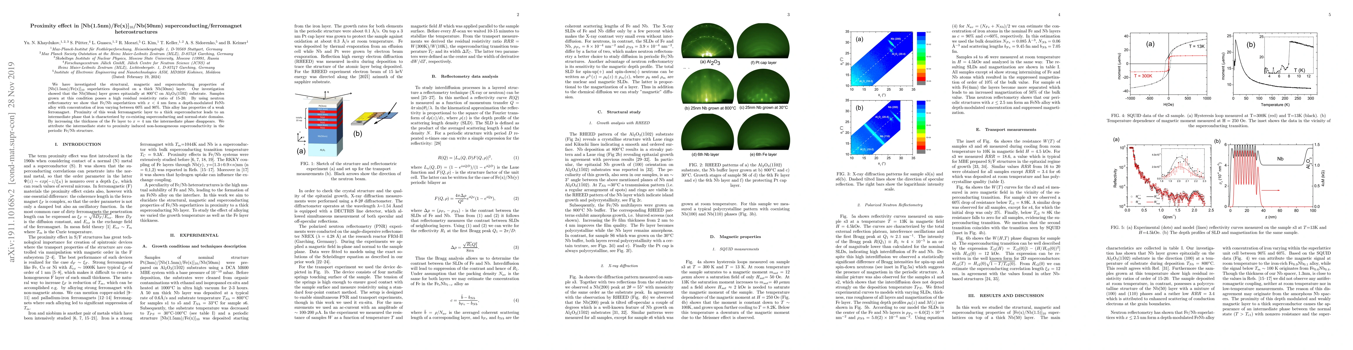 We have investigated the structural, magnetic and superconducting properties of [Nb(1.5nm)/Fe(x)]$_{10}$ superlattices deposited on a thick Nb(50nm) layer. Our investigation showed that the Nb(50nm) layer grows epitaxially at 800$^\circ$C on Al$_2$O$_3$(1$\bar{1}$02) substrate. Samples grown at this condition posses a high residual resistivity ratio of 15-20. By using neutron reflectometry we show that Fe/Nb superlattices with $x<$ 4 nm form a depth-modulated FeNb alloy with concentration of iron varying between 60% and 90%. This alloy has properties of a weak ferromagnet. Proximity of this weak ferromagnetic layer to a thick superconductor leads to an intermediate phase that is characterized by co-existing superconducting and normal-state domains. By increasing the thickness of the Fe layer to $x$ = 4 nm the intermediate phase disappears. We attribute the intermediate state to proximity induced non-homogeneous superconductivity in the periodic Fe/Nb structure.