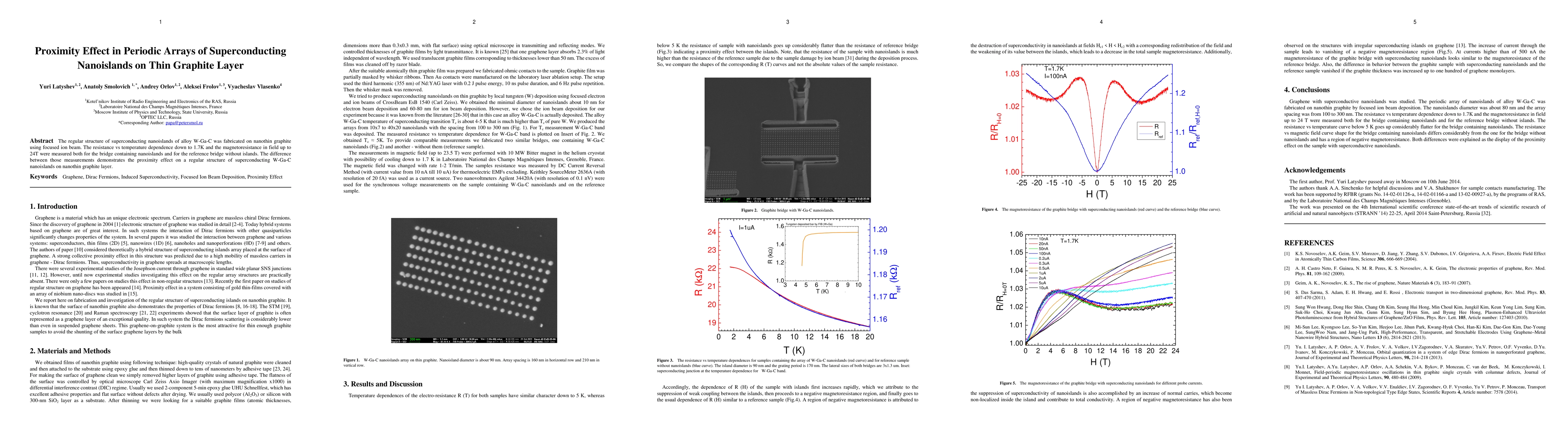 The regular structure of superconducting nanoislands of alloy W-Ga-C was fabricated on nanothin graphite using focused ion beam. The resistance vs temperature dependence down to 1.7K and the magnetoresistance in field up to 24T were measured both for the bridge containing nanoislands and for the reference bridge without islands. The difference between those measurements demonstrates the proximity effect on a regular structure of superconducting W-Ga-C nanoislands on nanothin graphite layer.