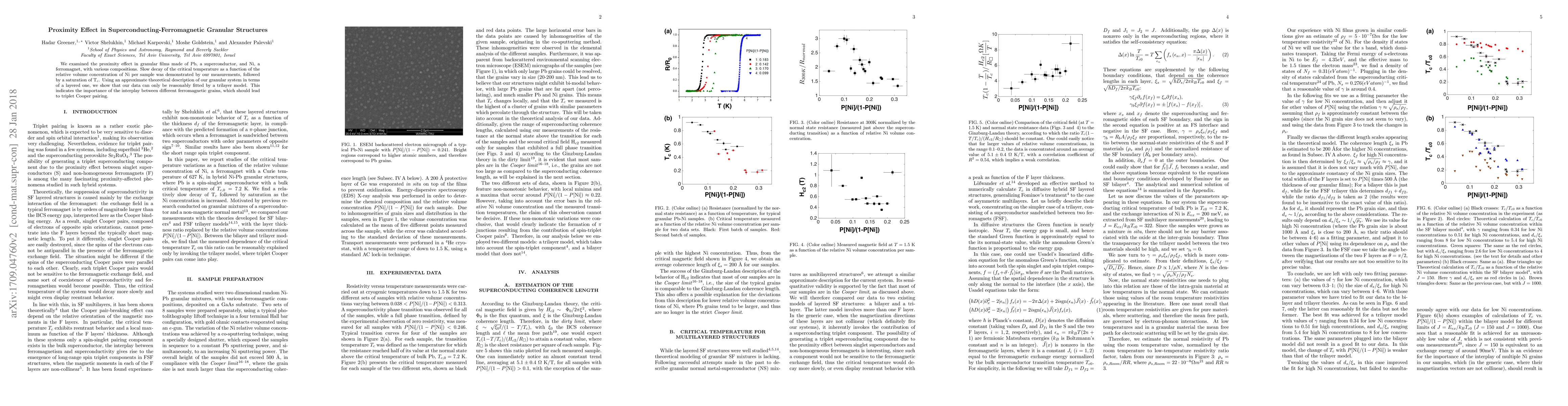 This study investigates the proximity effect in Pb/Ni granular films, revealing a gradual decline in critical temperature with increasing Ni concentration, followed by saturation. Theoretical modeling suggests that a multilayer approach best fits the data, highlighting the significance of intergrain interactions in non-collinear ferromagnetic states, which facilitate triplet Cooper pairing.