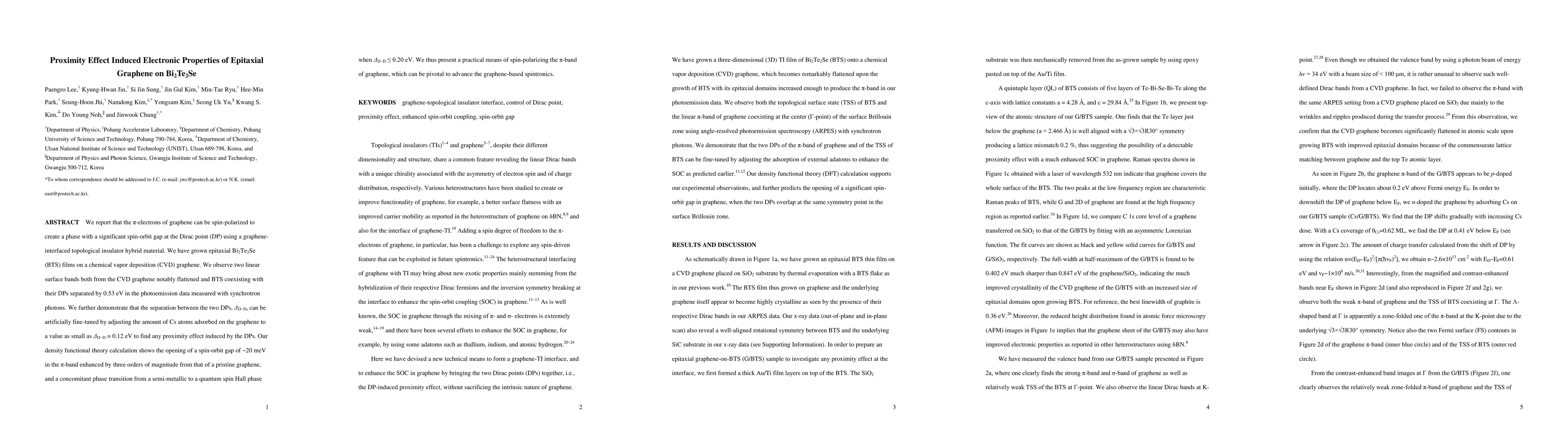 This paper reports on the spin-polarization of {\pi}-electrons in epitaxial graphene grown on Bi2Te2Se, creating a topological phase with a significant spin-orbit gap. The study demonstrates that the separation between Dirac points can be fine-tuned by Cs adsorption, leading to a potential quantum spin Hall phase transition and significant implications for graphene-based spintronics.