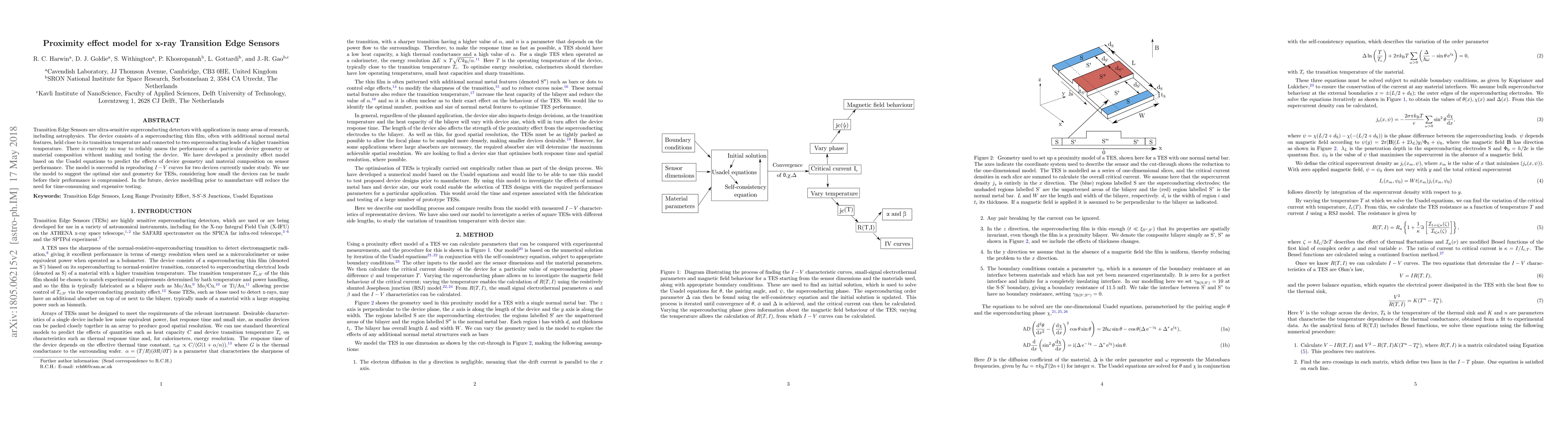 This paper develops a proximity effect model based on Usadel equations to predict the performance of Transition Edge Sensors (TESs) without physical testing. The model successfully reproduces I-V curves for existing devices and suggests optimal device sizes and geometries, potentially reducing the need for costly and time-consuming testing.