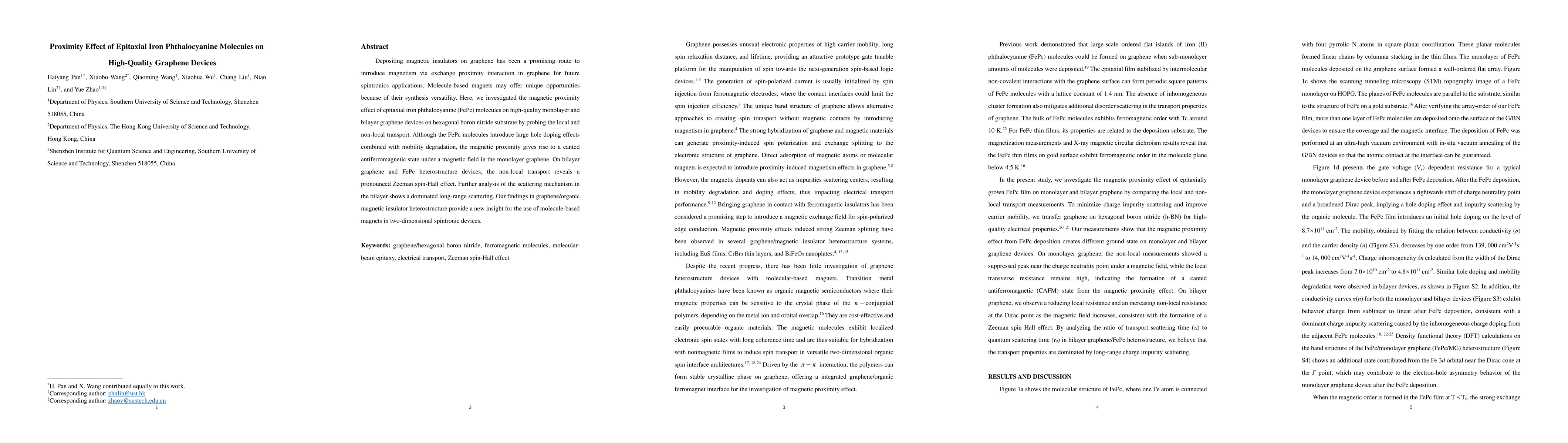 This study investigates the magnetic proximity effect of epitaxial iron phthalocyanine molecules on graphene devices, revealing a canted antiferromagnetic state in monolayer graphene and a pronounced Zeeman spin-Hall effect in bilayer graphene, suggesting potential for molecule-based magnets in 2D spintronics.