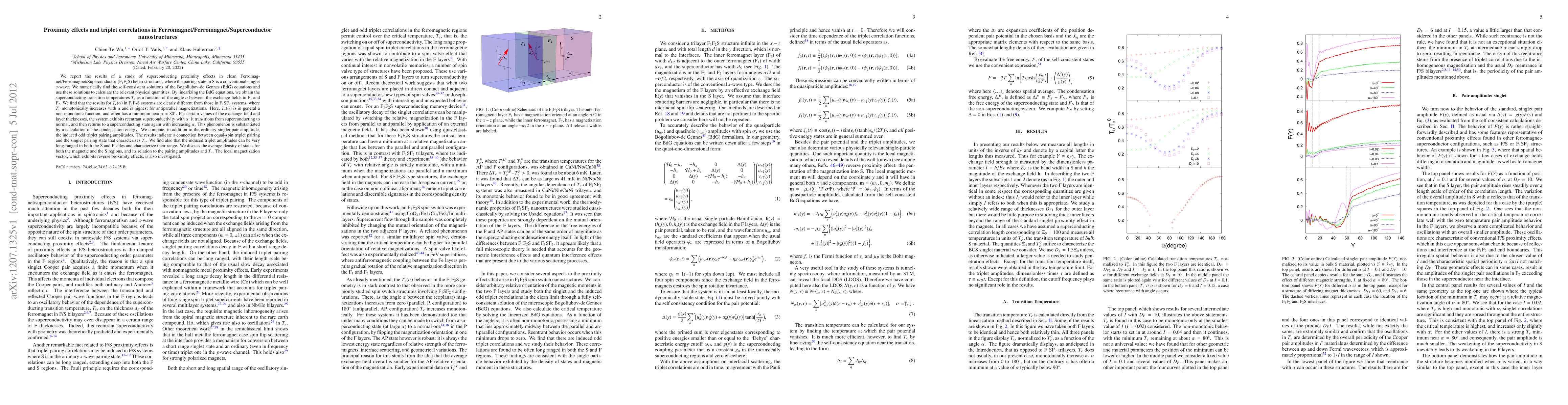 Researchers studied superconducting proximity effects in nanostructures with ferromagnet/ferromagnet/superconductor layers and found that the superconducting transition temperature varies non-monotonically with the angle between exchange fields, sometimes exhibiting reentrant superconductivity.