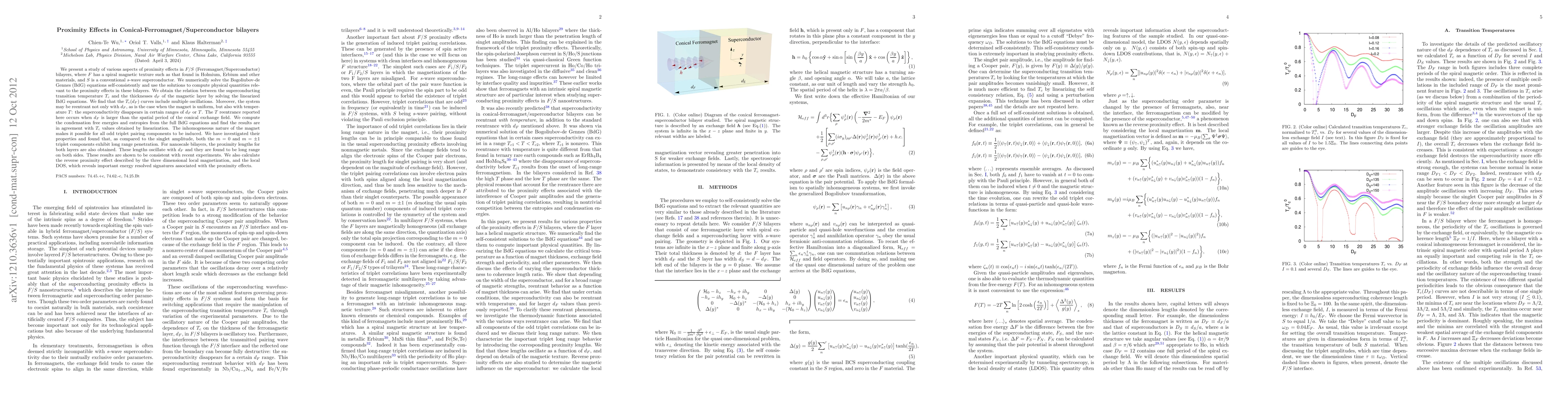 Researchers studied proximity effects in conical-ferromagnet/superconductor bilayers, finding oscillating superconducting transition temperatures with varying layer thicknesses and temperature ranges, as well as long-range penetration of odd triplet pairing components.