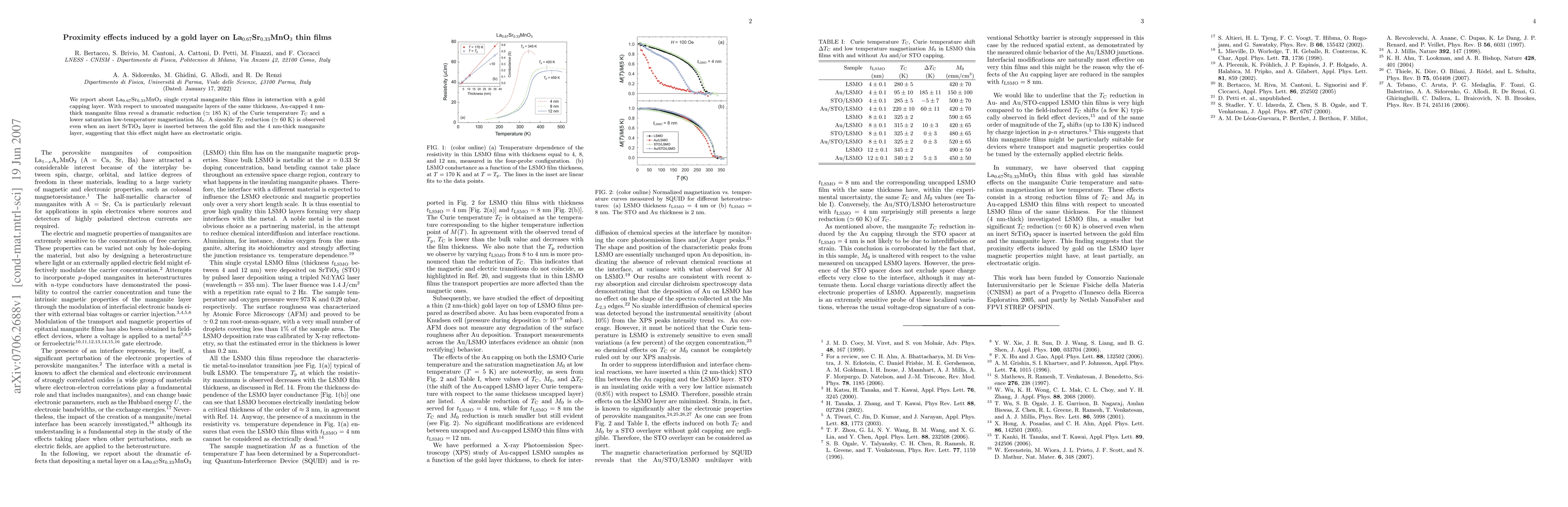 Thin layers of La0.67Sr0.33MnO3 were found to have significantly reduced Curie temperatures when capped with a thin layer of gold, even when an inert layer was inserted between the gold and manganite layers.