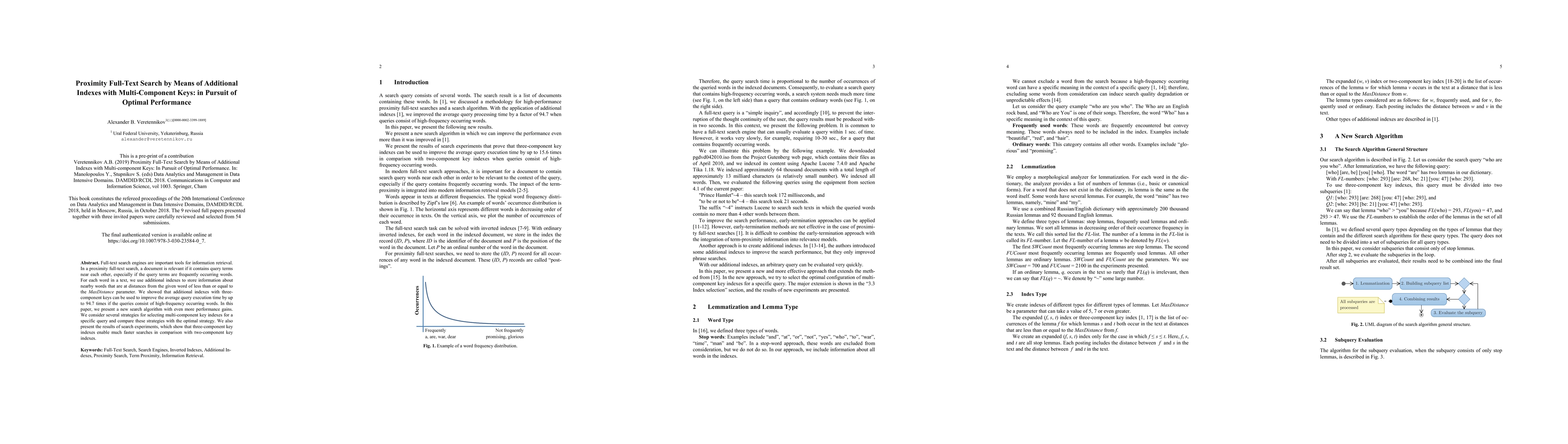 Full-text search engines are important tools for information retrieval. In a proximity full-text search, a document is relevant if it contains query terms near each other, especially if the query terms are frequently occurring words. For each word in a text, we use additional indexes to store information about nearby words that are at distances from the given word of less than or equal to the MaxDistance parameter. We showed that additional indexes with three-component keys can be used to improve the average query execution time by up to 94.7 times if the queries consist of high-frequency occurring words. In this paper, we present a new search algorithm with even more performance gains. We consider several strategies for selecting multi-component key indexes for a specific query and compare these strategies with the optimal strategy. We also present the results of search experiments, which show that three-component key indexes enable much faster searches in comparison with two-component key indexes. This is a pre-print of a contribution "Veretennikov A.B. (2019) Proximity Full-Text Search by Means of Additional Indexes with Multi-component Keys: In Pursuit of Optimal Performance." published in "Manolopoulos Y., Stupnikov S. (eds) Data Analytics and Management in Data Intensive Domains. DAMDID/RCDL 2018. Communications in Computer and Information Science, vol 1003" published by Springer, Cham. This book constitutes the refereed proceedings of the 20th International Conference on Data Analytics and Management in Data Intensive Domains, DAMDID/RCDL 2018, held in Moscow, Russia, in October 2018. The 9 revised full papers presented together with three invited papers were carefully reviewed and selected from 54 submissions. The final authenticated version is available online at https://doi.org/10.1007/978-3-030-23584-0_7.