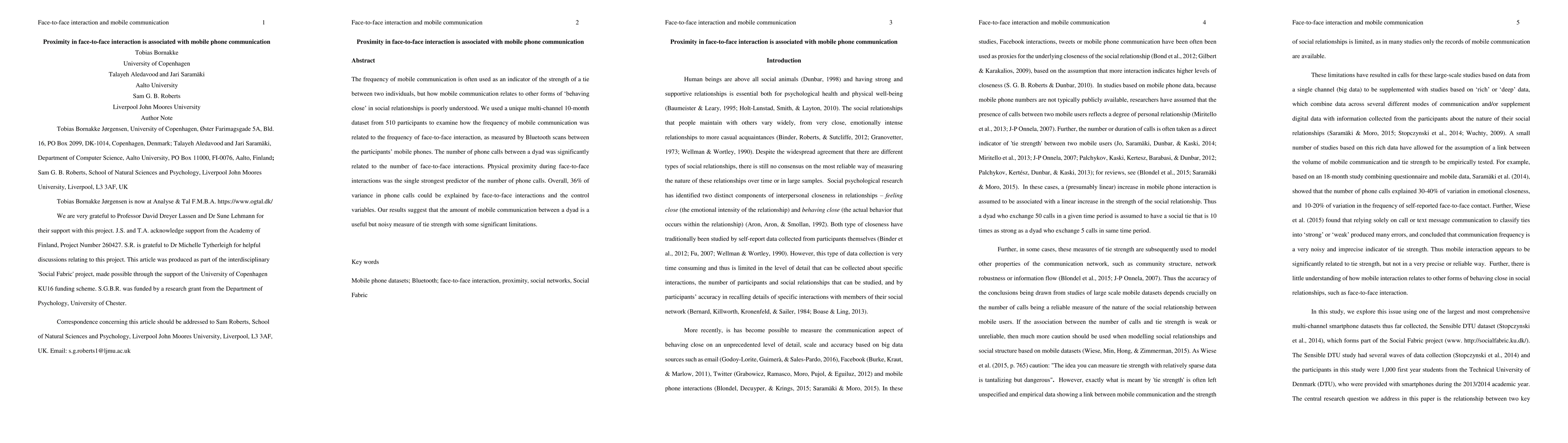 This study finds a significant correlation between the frequency of mobile phone calls and face-to-face interactions, with physical proximity during face-to-face interactions being the strongest predictor of phone calls. However, mobile communication is a noisy measure of tie strength due to its limitations.