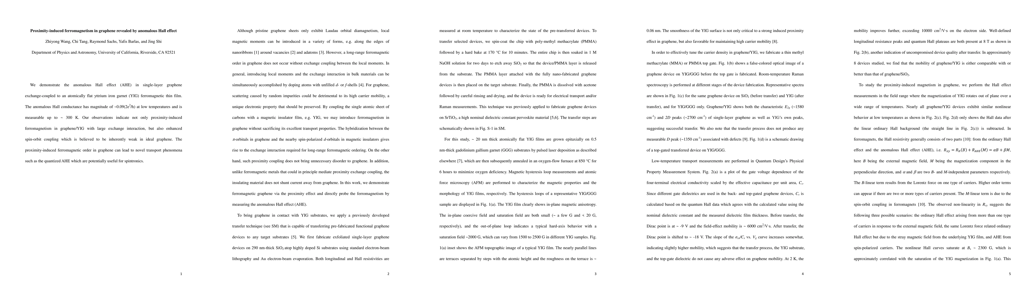 This study reveals proximity-induced ferromagnetism in graphene when exchange-coupled with a yttrium iron garnet (YIG) ferromagnetic thin film, as evidenced by the anomalous Hall effect (AHE). The observed AHE indicates enhanced spin-orbit coupling and measurable conductance up to ~300 K, suggesting potential applications in spintronics.
