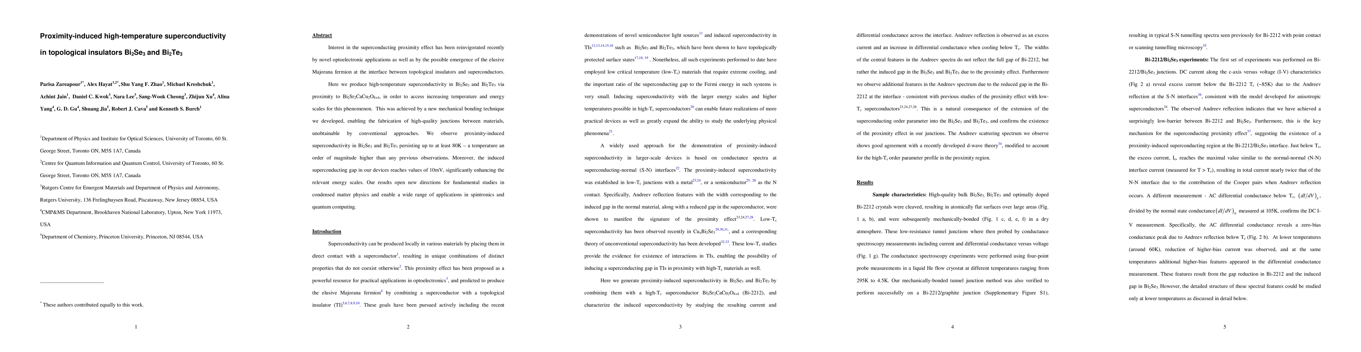 This paper reports the successful induction of high-temperature superconductivity in topological insulators Bi2Se3 and Bi2Te3 via proximity to a high-temperature superconductor, achieved using a novel mechanical bonding technique. The observed proximity-induced superconductivity persists up to 80K, significantly higher than previous observations, with a superconducting gap of 10mV.