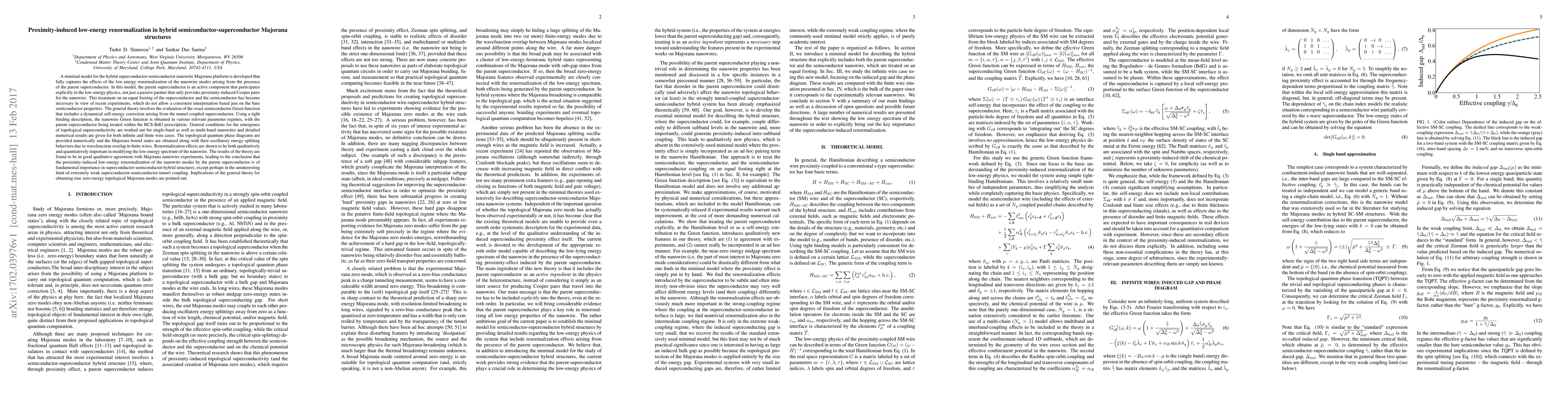 A minimal model for the hybrid superconductor-semiconductor nanowire Majorana platform is developed that fully captures the effects of the low-energy renormalization of the nanowire modes arising from the presence of the parent superconductor. In this model, the parent superconductor is an active component that participates explicitly in the low-energy physics, not just a passive partner that only provides proximity-induced Cooper pairs for the nanowire. This treatment on an equal footing of the superconductor and the semiconductor has become necessary in view of recent experiments, which do not allow a consistent interpretation based just on the bare semiconductor properties. The general theory involves the evaluation of the exact semiconductor Green function that includes a dynamical self-energy correction arising from the tunnel-coupled superconductor. General conditions for the emergence of topological superconductivity are worked out for single-band as well as multi-band nanowires and detailed numerical results are given for both infinite and finite wire cases. The topological quantum phase diagrams are provided numerically and the Majorana bound states are obtained along with their oscillatory energy splitting behaviors due to wavefunction overlap in finite wires. Renormalization effects are shown to be both qualitatively and quantitatively important in modifying the low-energy spectrum of the nanowire. The results of the theory are found to be in good qualitative agreement with Majorana nanowire experiments, leading to the conclusion that the proximity-induced low-energy renormalization of the nanowire modes by the parent superconductor is of fundamental importance in superconductor-semiconductor hybrid structures. Implications of the general theory for obtaining true zero energy topological Majorana modes are pointed out.
