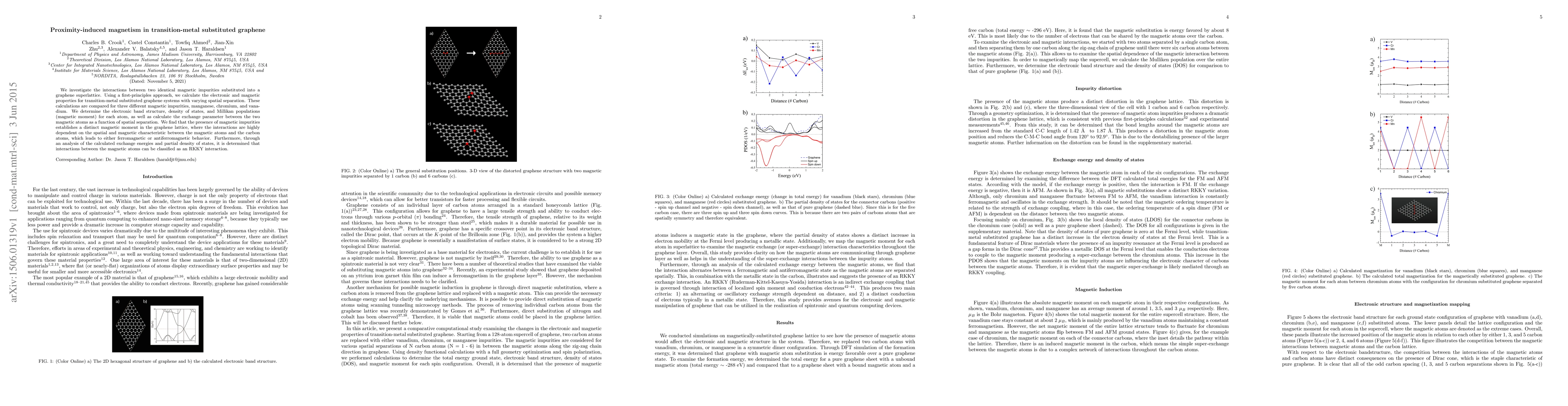 We investigate the interactions between two identical magnetic impurities substituted into a graphene superlattice. Using a first-principles approach, we calculate the electronic and magnetic properties for transition-metal substituted graphene systems with varying spatial separation. These calculations are compared for three different magnetic impurities, manganese, chromium, and vanadium. We determine the electronic band structure, density of states, and Millikan populations (magnetic moment) for each atom, as well as calculate the exchange parameter between the two magnetic atoms as a function of spatial separation. We find that the presence of magnetic impurities establishes a distinct magnetic moment in the graphene lattice, where the interactions are highly dependent on the spatial and magnetic characteristic between the magnetic atoms and the carbon atoms, which leads to either ferromagnetic or antiferromagnetic behavior. Furthermore, through an analysis of the calculated exchange energies and partial density of states, it is determined that interactions between the magnetic atoms can be classified as an RKKY interaction.