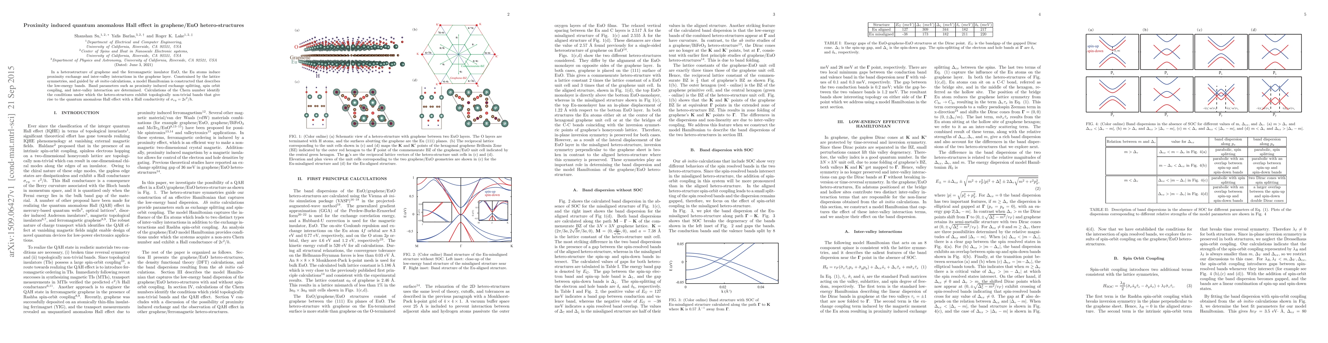 In a heterostructure of graphene and the ferromagnetic insulator EuO, the Eu atoms induce proximity exchange and inter-valley interactions in the graphene layer. Constrained by the lattice symmetries, and guided by ab initio calculations, a model Hamiltonian is constructed that describes the low-energy bands. Band parameters such as proximity induced exchange splitting, spin orbit coupling, and inter-valley interaction are determined. Calculations of the Chern number identify the conditions under which the hetero-structures exhibit topologically non-trivial bands that give rise to the quantum anomalous Hall effect with a Hall conductivity of $\sigma_{xy} = 2 e^2/h$.