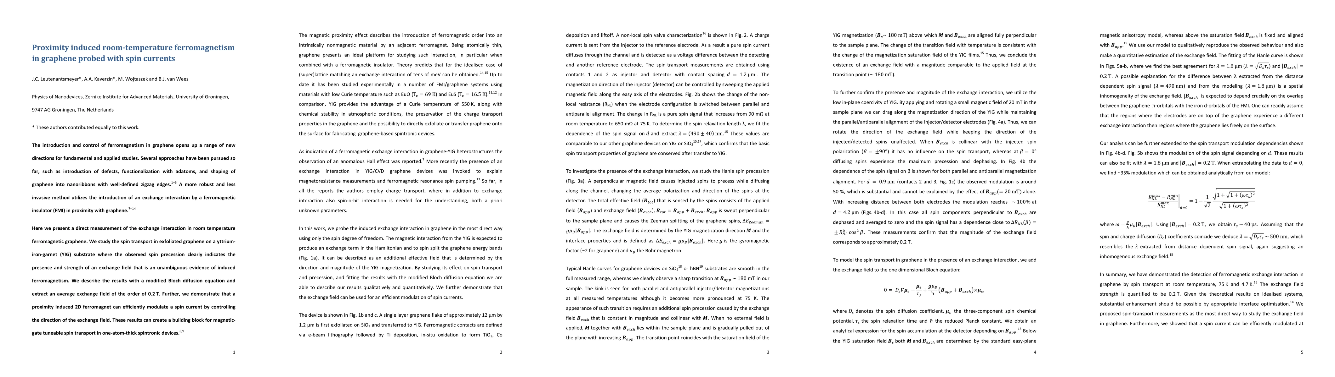 This paper reports on the direct measurement of proximity-induced ferromagnetism in graphene at room temperature using spin currents. The study shows that a ferromagnetic insulator can induce an exchange interaction in graphene, evidenced by observed spin precession, and proposes a modified Bloch diffusion equation to describe the results, indicating an average exchange field of 0.2 T. This discovery could enable magnetic-gate tunable spin transport in ultra-thin spintronic devices.