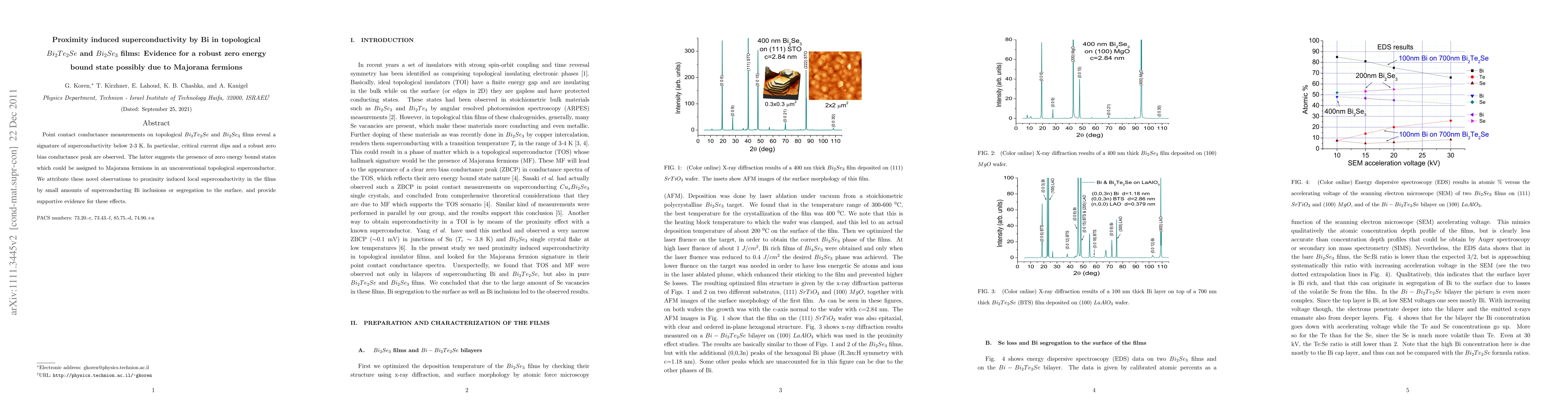 Point contact conductance measurements on topological $Bi_2Te_2Se$ and $Bi_2Se_3$ films reveal a signature of superconductivity below 2-3 K. In particular, critical current dips and a robust zero bias conductance peak are observed. The latter suggests the presence of zero energy bound states which could be assigned to Majorana Fermions in an unconventional topological superconductor. We attribute these novel observations to proximity induced local superconductivity in the films by small amounts of superconducting Bi inclusions or segregation to the surface, and provide supportive evidence for these effects.