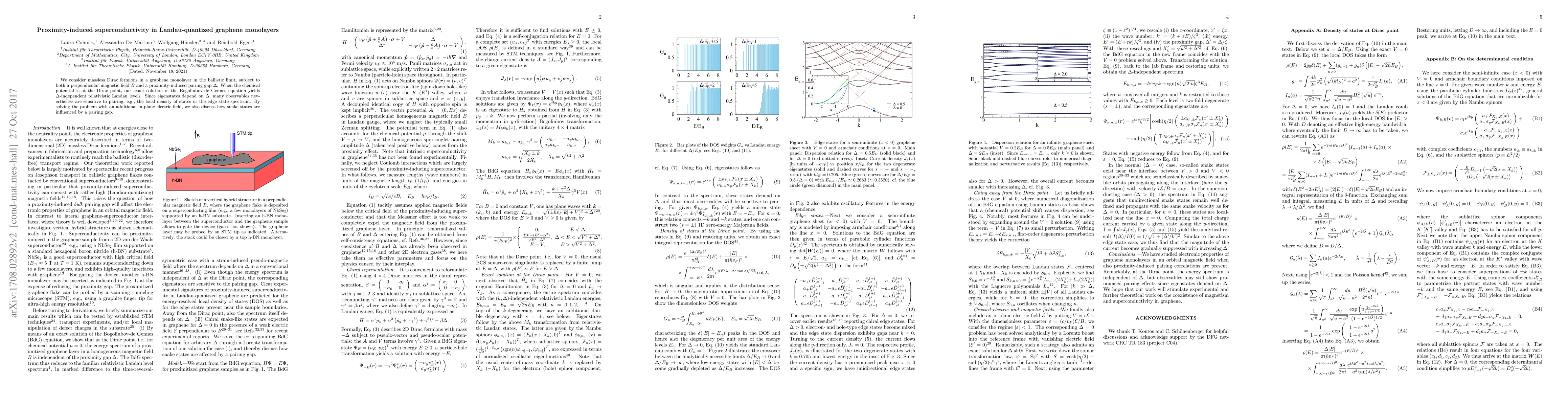 We consider massless Dirac fermions in a graphene monolayer subject to both a perpendicular magnetic field $B$ and a proximity-induced pairing gap $\Delta$. When the chemical potential is at the Dirac point, our exact solution of the Bogoliubov-de Gennes equation yields $\Delta$-independent relativistic Landau levels. Since eigenstates depend on $\Delta$, many observables nevertheless are sensitive to pairing, e.g., the local density of states or the edge state spectrum. By solving the problem with an additional in-plane electric field, we also discuss how snake states are influenced by a pairing gap.