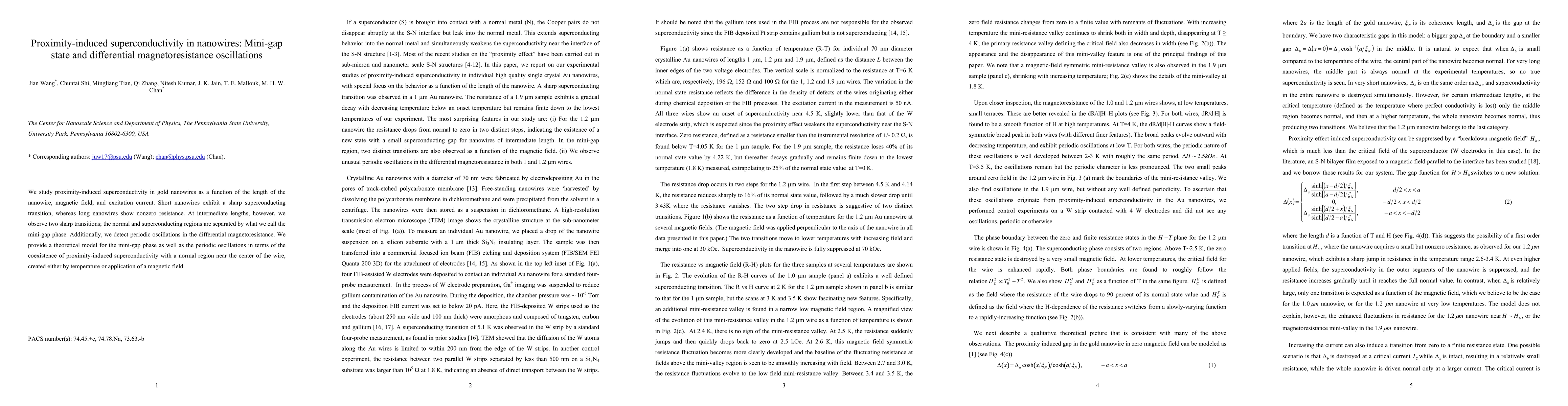 This paper investigates proximity-induced superconductivity in gold nanowires, revealing a mini-gap phase at intermediate lengths characterized by two sharp transitions between normal and superconducting states. It also observes periodic oscillations in differential magnetoresistance, explained by a theoretical model involving coexistence of superconductivity with a normal region.