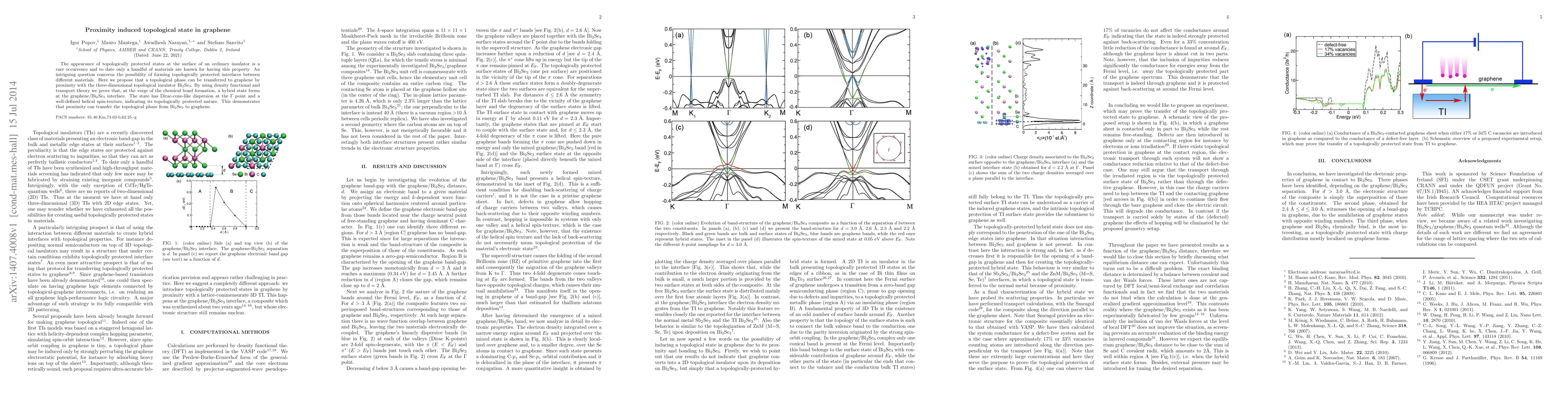 This paper demonstrates that proximity to the three-dimensional topological insulator Bi$_2$Se$_3$ can induce a topologically protected state in graphene, characterized by a Dirac-cone-like dispersion and helical spin-texture, indicating the transfer of topological phase from Bi$_2$Se$_3$ to graphene.