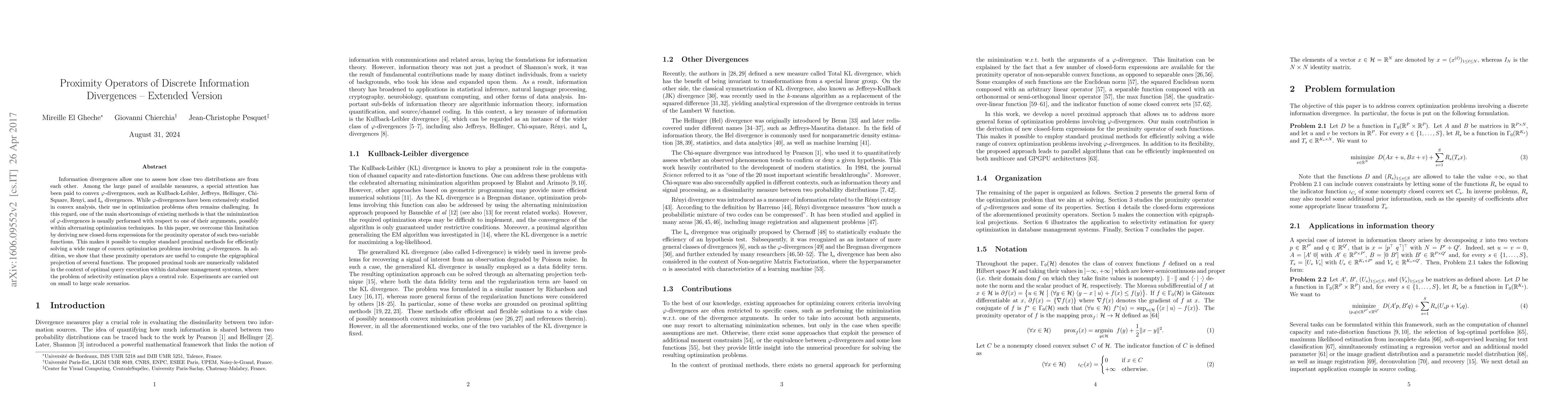 Information divergences allow one to assess how close two distributions are from each other. Among the large panel of available measures, a special attention has been paid to convex $\varphi$-divergences, such as Kullback-Leibler, Jeffreys-Kullback, Hellinger, Chi-Square, Renyi, and I$_{\alpha}$ divergences. While $\varphi$-divergences have been extensively studied in convex analysis, their use in optimization problems often remains challenging. In this regard, one of the main shortcomings of existing methods is that the minimization of $\varphi$-divergences is usually performed with respect to one of their arguments, possibly within alternating optimization techniques. In this paper, we overcome this limitation by deriving new closed-form expressions for the proximity operator of such two-variable functions. This makes it possible to employ standard proximal methods for efficiently solving a wide range of convex optimization problems involving $\varphi$-divergences. In addition, we show that these proximity operators are useful to compute the epigraphical projection of several functions of practical interest. The proposed proximal tools are numerically validated in the context of optimal query execution within database management systems, where the problem of selectivity estimation plays a central role. Experiments are carried out on small to large scale scenarios.