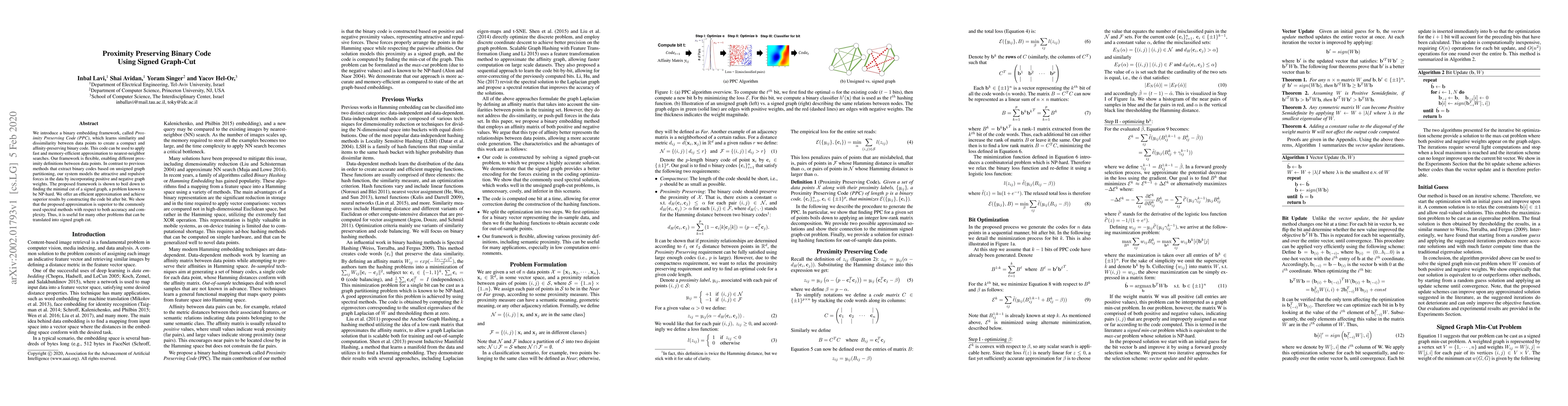 We introduce a binary embedding framework, called Proximity Preserving Code (PPC), which learns similarity and dissimilarity between data points to create a compact and affinity-preserving binary code. This code can be used to apply fast and memory-efficient approximation to nearest-neighbor searches. Our framework is flexible, enabling different proximity definitions between data points. In contrast to previous methods that extract binary codes based on unsigned graph partitioning, our system models the attractive and repulsive forces in the data by incorporating positive and negative graph weights. The proposed framework is shown to boil down to finding the minimal cut of a signed graph, a problem known to be NP-hard. We offer an efficient approximation and achieve superior results by constructing the code bit after bit. We show that the proposed approximation is superior to the commonly used spectral methods with respect to both accuracy and complexity. Thus, it is useful for many other problems that can be translated into signed graph cut.