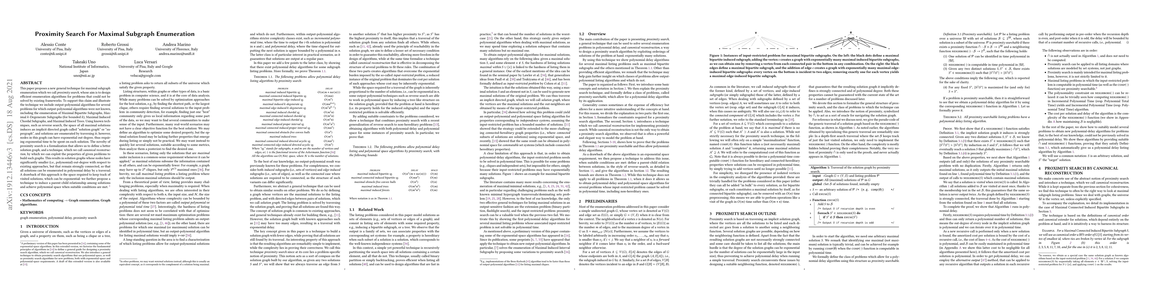 This paper introduces a novel proximity search technique for efficient maximal subgraph enumeration, enabling output-polynomial algorithms for problems previously unsolved by existing frameworks. The method constructs a more efficient "solution graph" with reduced out-degree, allowing enumeration in polynomial delay, while addressing space complexity through a parent-child relationship among solutions.