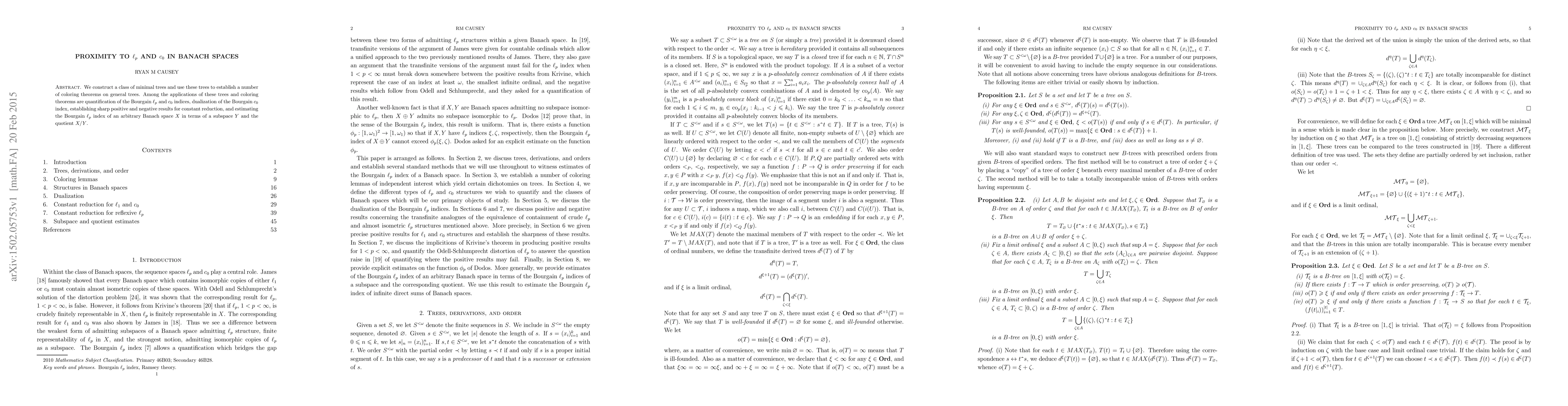 We construct a class of minimal trees and use these trees to establish a number of coloring theorems on general trees. Among the applications of these trees and coloring theorems are quantification of the Bourgain $\ell_p$ and $c_0$ indices, dualization of the Bourgain $c_0$ index, establishing sharp positive and negative results for constant reduction, and estimating the Bourgain $\ell_p$ index of an arbitrary Banach space $X$ in terms of a subspace $Y$ and the quotient $X/Y$.