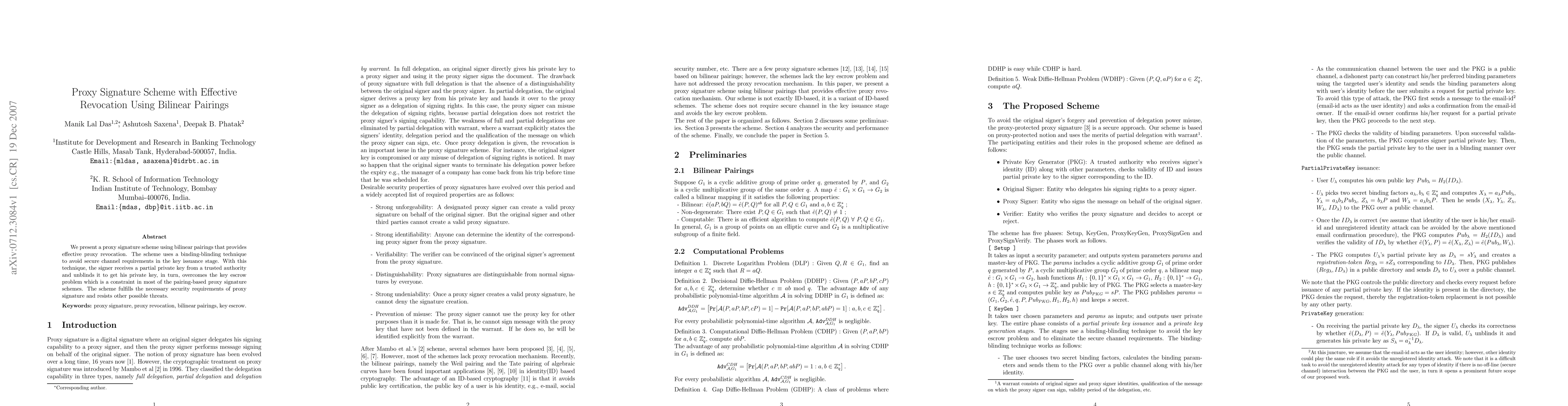 This paper proposes a proxy signature scheme leveraging bilinear pairings that enables effective revocation. It employs a binding-blinding method to eliminate the need for secure channels during key issuance, addressing the key escrow issue prevalent in existing schemes.