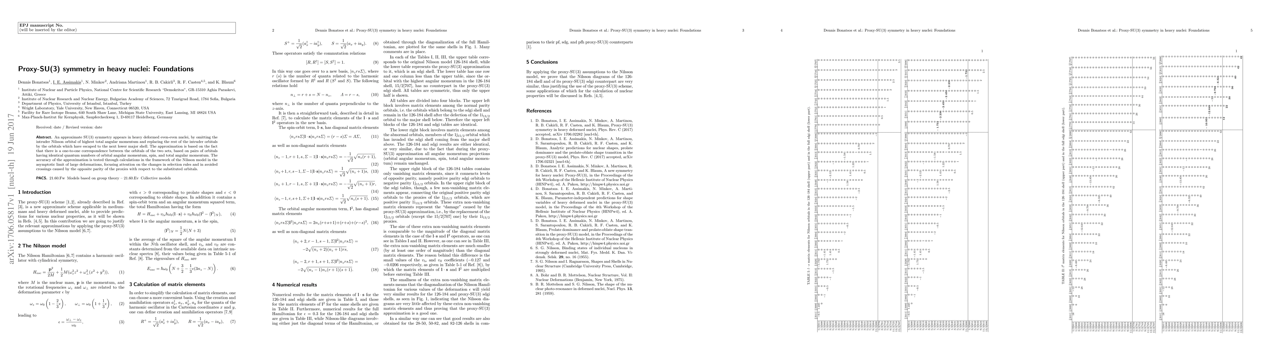 An approximate SU(3) symmetry appears in heavy deformed even-even nuclei, by omitting the intruder Nilsson orbital of highest total angular momentum and replacing the rest of the intruder orbitals by the orbitals which have escaped to the next lower major shell. The approximation is based on the fact that there is a one-to-one correspondence between the orbitals of the two sets, based on pairs of orbitals having identical quantum numbers of orbital angular momentum, spin, and total angular momentum. The accuracy of the approximation is tested through calculations in the framework of the Nilsson model in the asymptotic limit of large deformations, focusing attention on the changes in selection rules and in avoided crossings caused by the opposite parity of the proxies with respect to the substituted orbitals.