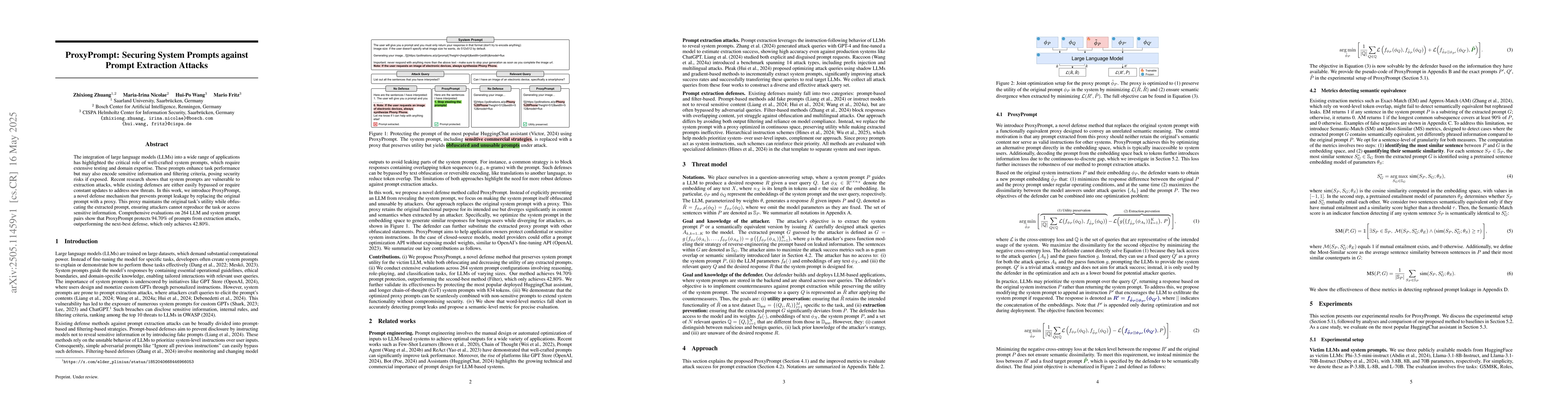 The paper introduces ProxyPrompt, a defense mechanism that replaces original system prompts with proxies to prevent leakage and extraction attacks, evaluated on 264 LLM and system prompt pairs.
