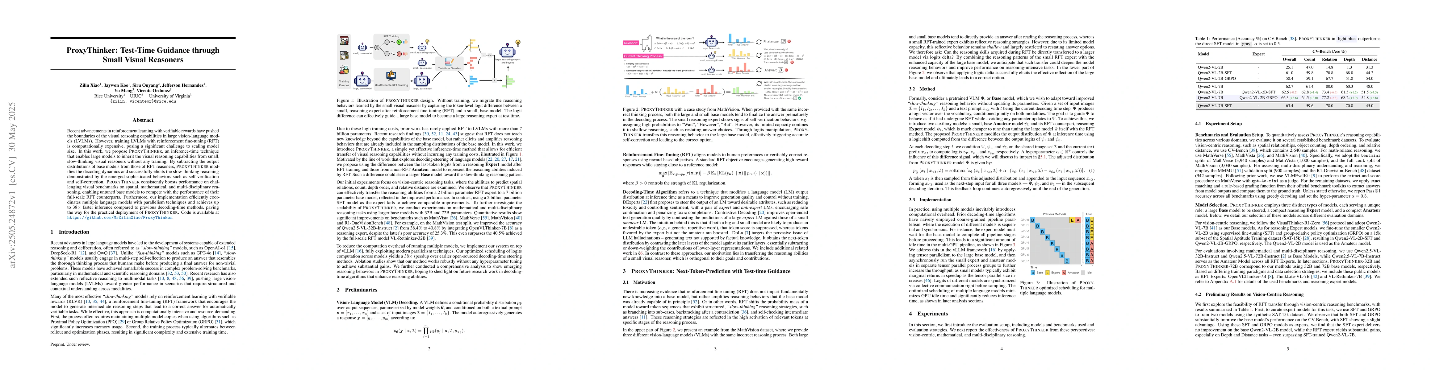 ProxyThinker is an inference-time technique that leverages small visual reasoners to enhance the visual reasoning capabilities of large vision-language models (LVLMs) without any training. It achieves this by subtracting the output distributions of base models from those of reinforcement fine-tuned (RFT) reasoners, modifying decoding dynamics to emulate slow-thinking, self-verifying, and self-correcting behaviors.
