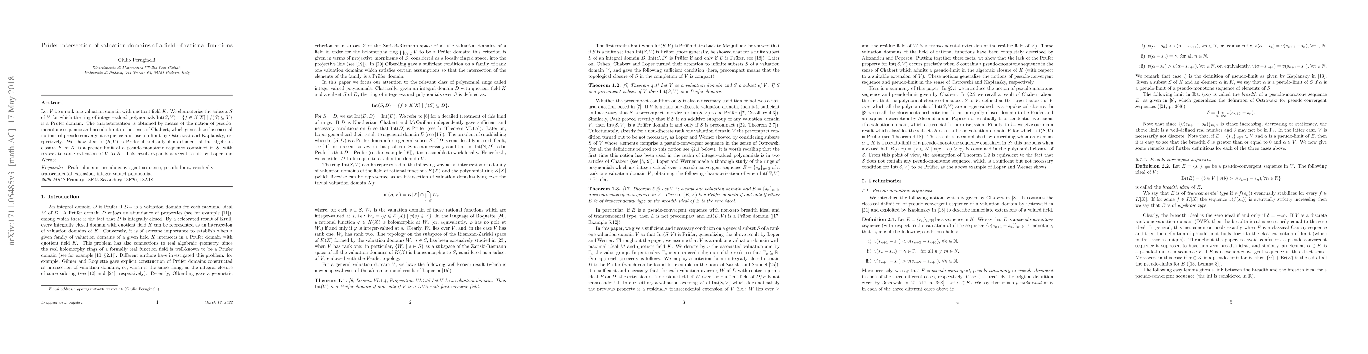 The paper characterizes subsets of a rank one valuation domain for which the ring of integer-valued polynomials is Pr"ufer, relating to pseudo-monotone sequences and pseudo-limits.