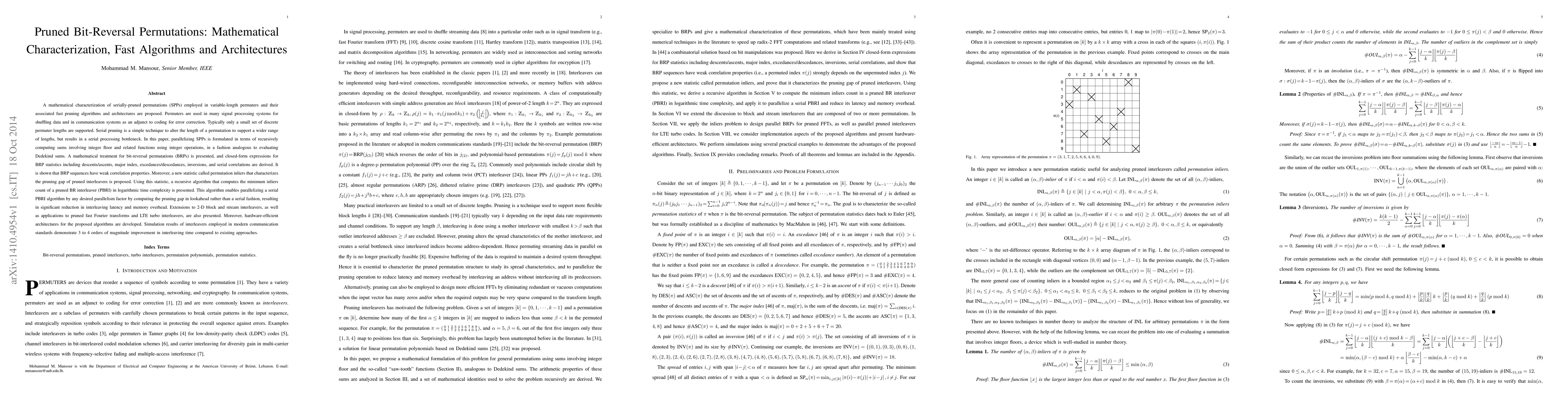A mathematical characterization of serially-pruned permutations (SPPs) employed in variable-length permuters and their associated fast pruning algorithms and architectures are proposed. Permuters are used in many signal processing systems for shuffling data and in communication systems as an adjunct to coding for error correction. Typically only a small set of discrete permuter lengths are supported. Serial pruning is a simple technique to alter the length of a permutation to support a wider range of lengths, but results in a serial processing bottleneck. In this paper, parallelizing SPPs is formulated in terms of recursively computing sums involving integer floor and related functions using integer operations, in a fashion analogous to evaluating Dedekind sums. A mathematical treatment for bit-reversal permutations (BRPs) is presented, and closed-form expressions for BRP statistics are derived. It is shown that BRP sequences have weak correlation properties. A new statistic called permutation inliers that characterizes the pruning gap of pruned interleavers is proposed. Using this statistic, a recursive algorithm that computes the minimum inliers count of a pruned BR interleaver (PBRI) in logarithmic time complexity is presented. This algorithm enables parallelizing a serial PBRI algorithm by any desired parallelism factor by computing the pruning gap in lookahead rather than a serial fashion, resulting in significant reduction in interleaving latency and memory overhead. Extensions to 2-D block and stream interleavers, as well as applications to pruned fast Fourier transforms and LTE turbo interleavers, are also presented. Moreover, hardware-efficient architectures for the proposed algorithms are developed. Simulation results demonstrate 3 to 4 orders of magnitude improvement in interleaving time compared to existing approaches.