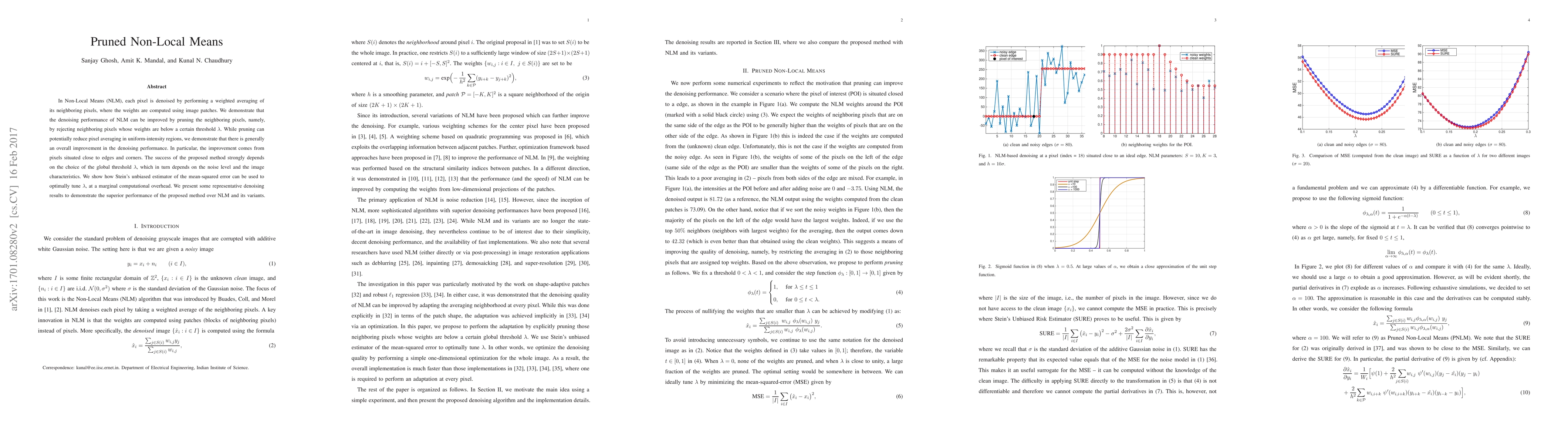 Researchers improved Non-Local Means denoising performance by pruning neighboring pixels with low weights, achieving better results in edges and corners, while optimizing the global threshold using Stein's unbiased estimator.