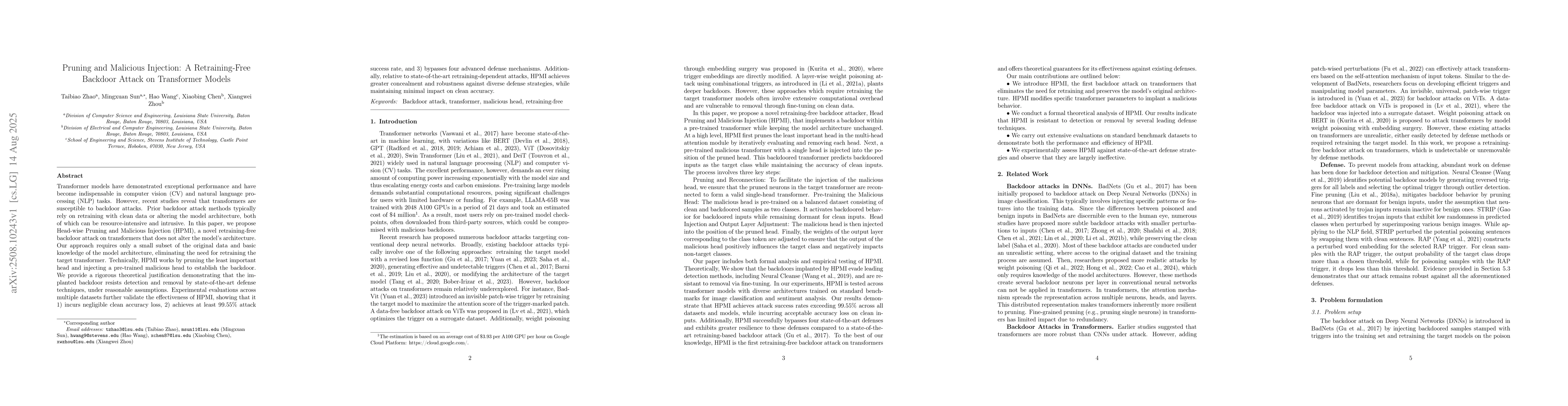 Transformer models have demonstrated exceptional performance and have become indispensable in computer vision (CV) and natural language processing (NLP) tasks. However, recent studies reveal that transformers are susceptible to backdoor attacks. Prior backdoor attack methods typically rely on retraining with clean data or altering the model architecture, both of which can be resource-intensive and intrusive. In this paper, we propose Head-wise Pruning and Malicious Injection (HPMI), a novel retraining-free backdoor attack on transformers that does not alter the model's architecture. Our approach requires only a small subset of the original data and basic knowledge of the model architecture, eliminating the need for retraining the target transformer. Technically, HPMI works by pruning the least important head and injecting a pre-trained malicious head to establish the backdoor. We provide a rigorous theoretical justification demonstrating that the implanted backdoor resists detection and removal by state-of-the-art defense techniques, under reasonable assumptions. Experimental evaluations across multiple datasets further validate the effectiveness of HPMI, showing that it 1) incurs negligible clean accuracy loss, 2) achieves at least 99.55% attack success rate, and 3) bypasses four advanced defense mechanisms. Additionally, relative to state-of-the-art retraining-dependent attacks, HPMI achieves greater concealment and robustness against diverse defense strategies, while maintaining minimal impact on clean accuracy.