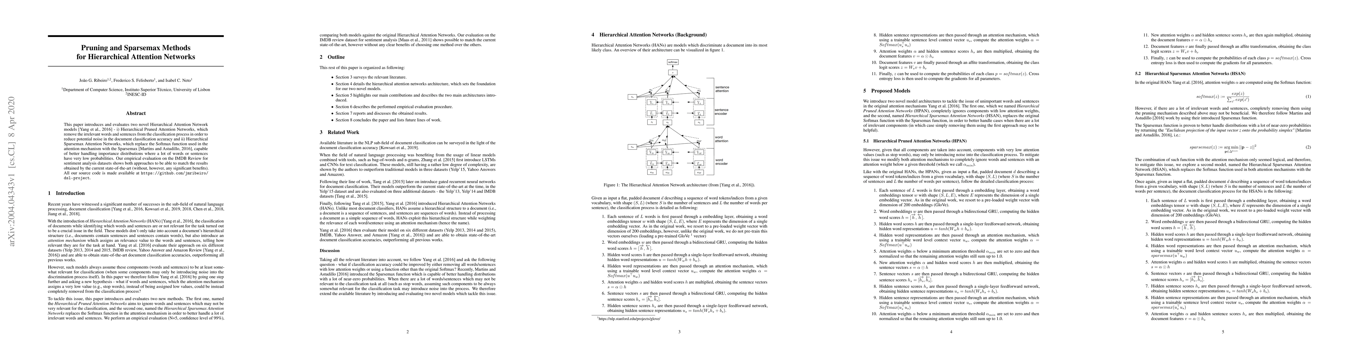 This paper proposes two enhancements to Hierarchical Attention Networks: Hierarchical Pruned Attention Networks to reduce noise by removing irrelevant words and sentences, and Hierarchical Sparsemax Attention Networks to improve attention mechanism efficiency. Both methods show comparable performance to state-of-the-art but without significant advantages. Source code is available at [GitHub](https://github.com/jmribeiro/dsl-project).