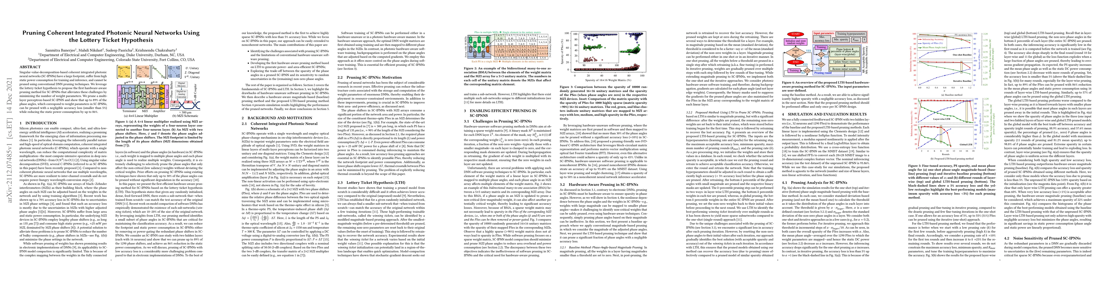 Singular-value-decomposition-based coherent integrated photonic neural networks (SC-IPNNs) have a large footprint, suffer from high static power consumption for training and inference, and cannot be pruned using conventional DNN pruning techniques. We leverage the lottery ticket hypothesis to propose the first hardware-aware pruning method for SC-IPNNs that alleviates these challenges by minimizing the number of weight parameters. We prune a multi-layer perceptron-based SC-IPNN and show that up to 89% of the phase angles, which correspond to weight parameters in SC-IPNNs, can be pruned with a negligible accuracy loss (smaller than 5%) while reducing the static power consumption by up to 86%.