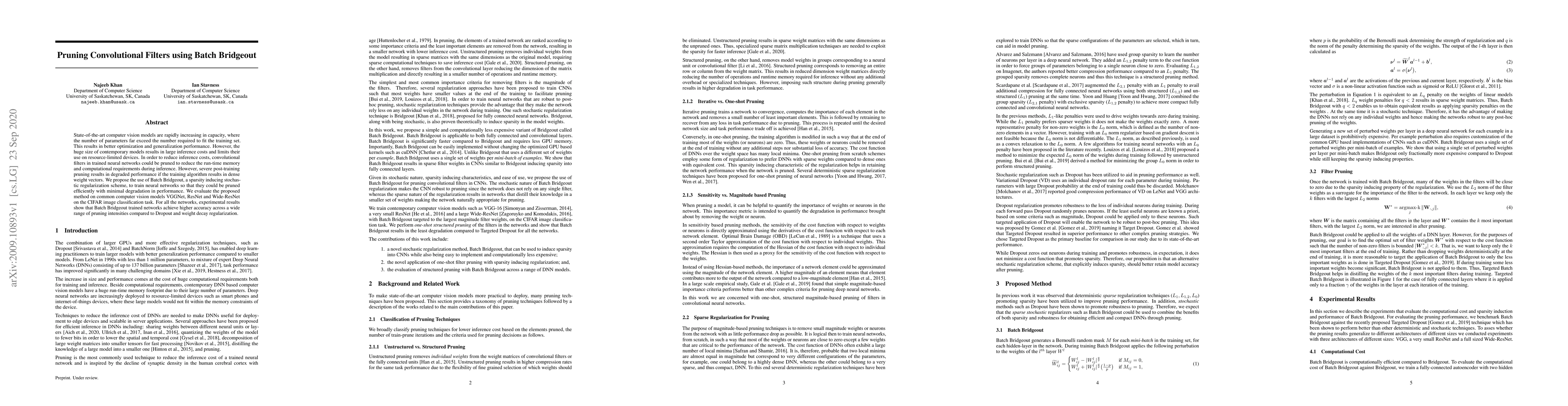 This research proposes a method to train neural networks with sparse filters using Batch Bridgeout, achieving higher accuracy than traditional regularization methods when pruned. It shows promising results on common computer vision models like VGGNet, ResNet, and Wide-ResNet on the CIFAR image classification task.