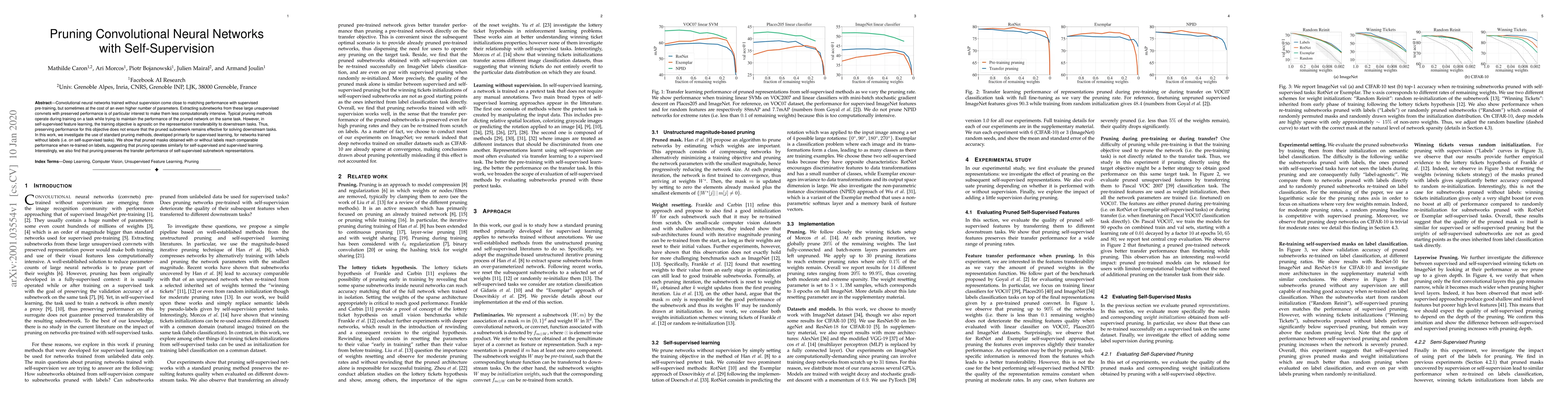 This paper explores applying conventional pruning techniques to convolutional neural networks trained via self-supervision to reduce computational load while maintaining performance. The study finds that pruned networks, when retrained with labels, perform comparably to non-pruned ones, indicating that pruning methods work similarly in both self-supervised and supervised contexts.