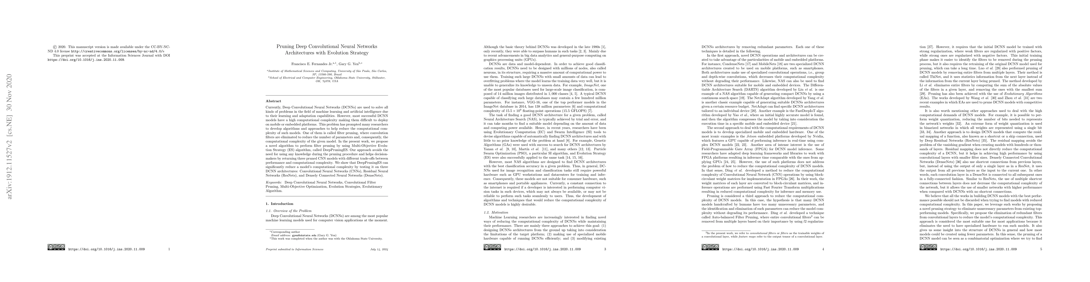 This paper proposes DeepPruningES, a novel Multi-Objective Evolution Strategy algorithm for pruning deep convolutional neural networks to reduce computational complexity. The method returns three pruned models with varying performance-complexity trade-offs, tested on CNNs, ResNets, and DenseNets.
