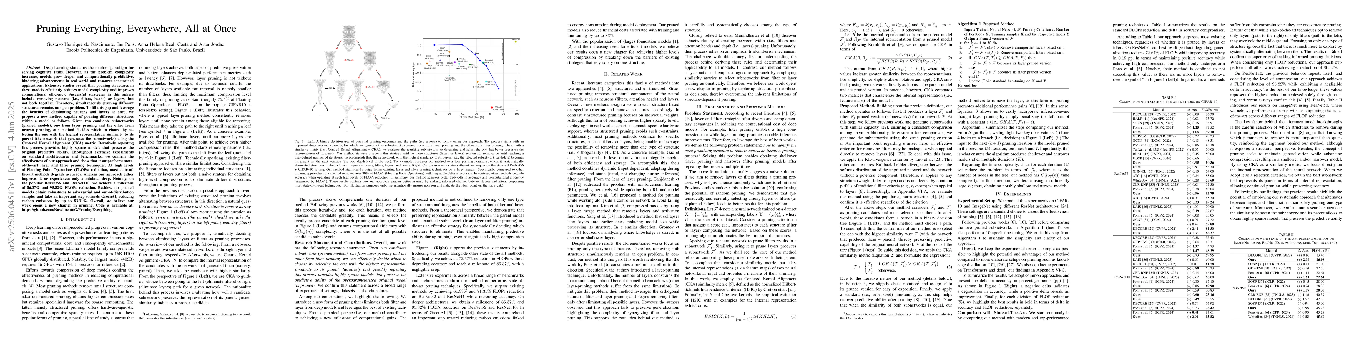 Deep learning stands as the modern paradigm for solving cognitive tasks. However, as the problem complexity increases, models grow deeper and computationally prohibitive, hindering advancements in real-world and resource-constrained applications. Extensive studies reveal that pruning structures in these models efficiently reduces model complexity and improves computational efficiency. Successful strategies in this sphere include removing neurons (i.e., filters, heads) or layers, but not both together. Therefore, simultaneously pruning different structures remains an open problem. To fill this gap and leverage the benefits of eliminating neurons and layers at once, we propose a new method capable of pruning different structures within a model as follows. Given two candidate subnetworks (pruned models), one from layer pruning and the other from neuron pruning, our method decides which to choose by selecting the one with the highest representation similarity to its parent (the network that generates the subnetworks) using the Centered Kernel Alignment metric. Iteratively repeating this process provides highly sparse models that preserve the original predictive ability. Throughout extensive experiments on standard architectures and benchmarks, we confirm the effectiveness of our approach and show that it outperforms state-of-the-art layer and filter pruning techniques. At high levels of Floating Point Operations reduction, most state-of-the-art methods degrade accuracy, whereas our approach either improves it or experiences only a minimal drop. Notably, on the popular ResNet56 and ResNet110, we achieve a milestone of 86.37% and 95.82% FLOPs reduction. Besides, our pruned models obtain robustness to adversarial and out-of-distribution samples and take an important step towards GreenAI, reducing carbon emissions by up to 83.31%. Overall, we believe our work opens a new chapter in pruning.