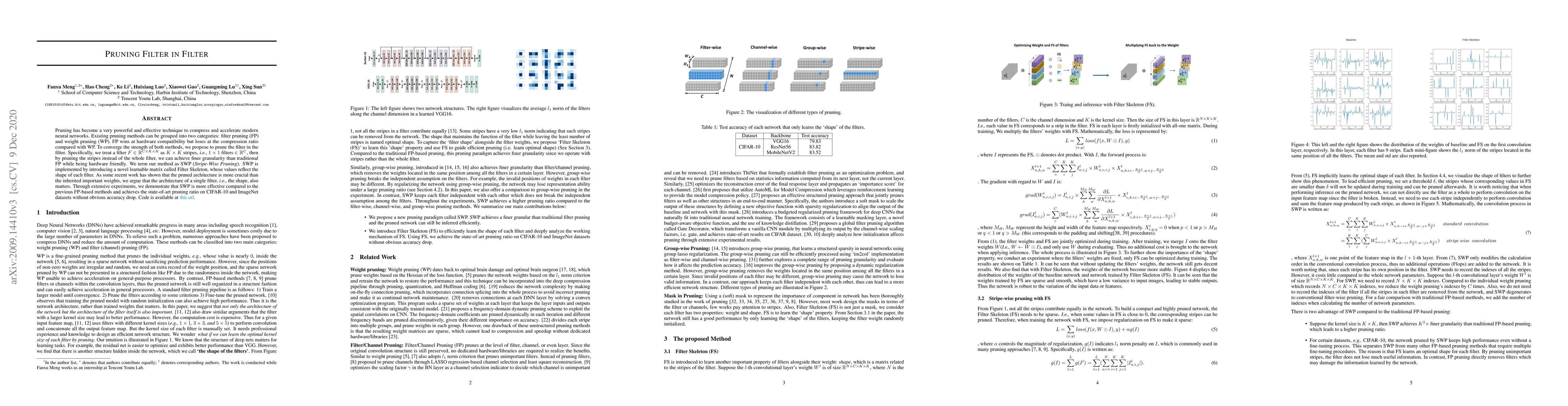 Pruning has become a very powerful and effective technique to compress and accelerate modern neural networks. Existing pruning methods can be grouped into two categories: filter pruning (FP) and weight pruning (WP). FP wins at hardware compatibility but loses at the compression ratio compared with WP. To converge the strength of both methods, we propose to prune the filter in the filter. Specifically, we treat a filter $F \in \mathbb{R}^{C\times K\times K}$ as $K \times K$ stripes, i.e., $1\times 1$ filters $\in \mathbb{R}^{C}$, then by pruning the stripes instead of the whole filter, we can achieve finer granularity than traditional FP while being hardware friendly. We term our method as SWP (\emph{Stripe-Wise Pruning}). SWP is implemented by introducing a novel learnable matrix called Filter Skeleton, whose values reflect the shape of each filter. As some recent work has shown that the pruned architecture is more crucial than the inherited important weights, we argue that the architecture of a single filter, i.e., the shape, also matters. Through extensive experiments, we demonstrate that SWP is more effective compared to the previous FP-based methods and achieves the state-of-art pruning ratio on CIFAR-10 and ImageNet datasets without obvious accuracy drop. Code is available at https://github.com/fxmeng/Pruning-Filter-in-Filter