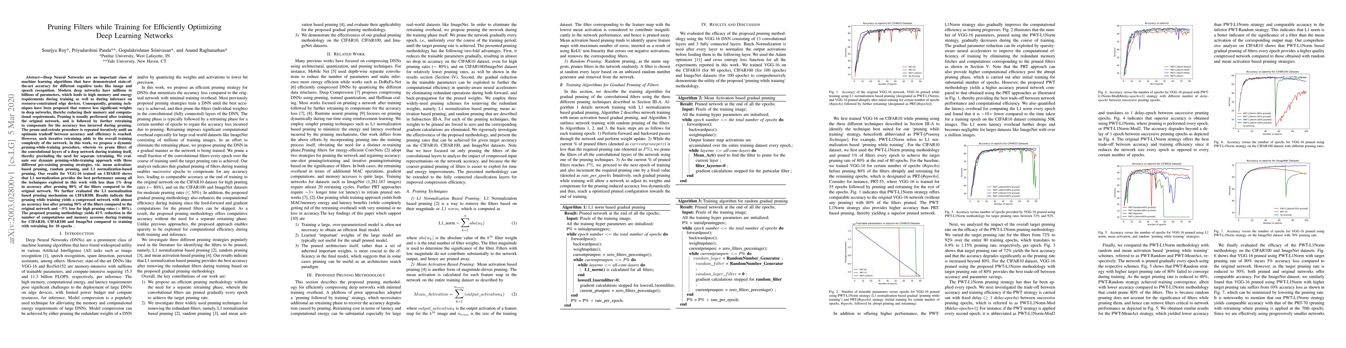 Modern deep networks have millions to billions of parameters, which leads to high memory and energy requirements during training as well as during inference on resource-constrained edge devices. Consequently, pruning techniques have been proposed that remove less significant weights in deep networks, thereby reducing their memory and computational requirements. Pruning is usually performed after training the original network, and is followed by further retraining to compensate for the accuracy loss incurred during pruning. The prune-and-retrain procedure is repeated iteratively until an optimum tradeoff between accuracy and efficiency is reached. However, such iterative retraining adds to the overall training complexity of the network. In this work, we propose a dynamic pruning-while-training procedure, wherein we prune filters of the convolutional layers of a deep network during training itself, thereby precluding the need for separate retraining. We evaluate our dynamic pruning-while-training approach with three different pre-existing pruning strategies, viz. mean activation-based pruning, random pruning, and L1 normalization-based pruning. Our results for VGG-16 trained on CIFAR10 shows that L1 normalization provides the best performance among all the techniques explored in this work with less than 1% drop in accuracy after pruning 80% of the filters compared to the original network. We further evaluated the L1 normalization based pruning mechanism on CIFAR100. Results indicate that pruning while training yields a compressed network with almost no accuracy loss after pruning 50% of the filters compared to the original network and ~5% loss for high pruning rates (>80%). The proposed pruning methodology yields 41% reduction in the number of computations and memory accesses during training for CIFAR10, CIFAR100 and ImageNet compared to training with retraining for 10 epochs .