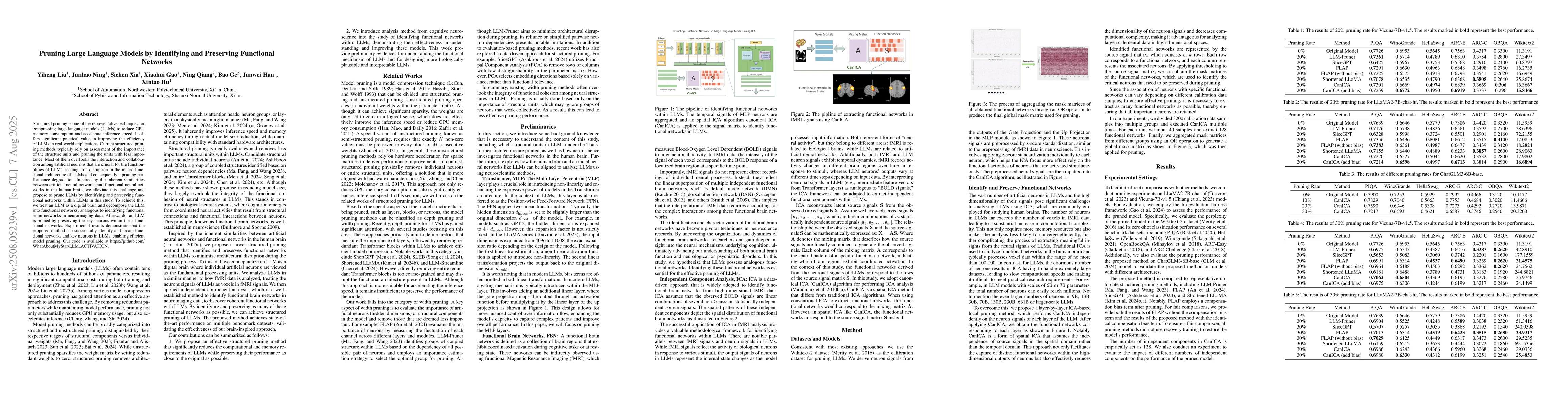 Structured pruning is one of the representative techniques for compressing large language models (LLMs) to reduce GPU memory consumption and accelerate inference speed. It offers significant practical value in improving the efficiency of LLMs in real-world applications. Current structured pruning methods typically rely on assessment of the importance of the structure units and pruning the units with less importance. Most of them overlooks the interaction and collaboration among artificial neurons that are crucial for the functionalities of LLMs, leading to a disruption in the macro functional architecture of LLMs and consequently a pruning performance degradation. Inspired by the inherent similarities between artificial neural networks and functional neural networks in the human brain, we alleviate this challenge and propose to prune LLMs by identifying and preserving functional networks within LLMs in this study. To achieve this, we treat an LLM as a digital brain and decompose the LLM into functional networks, analogous to identifying functional brain networks in neuroimaging data. Afterwards, an LLM is pruned by preserving the key neurons within these functional networks. Experimental results demonstrate that the proposed method can successfully identify and locate functional networks and key neurons in LLMs, enabling efficient model pruning. Our code is available at https://github.com/WhatAboutMyStar/LLM_ACTIVATION.