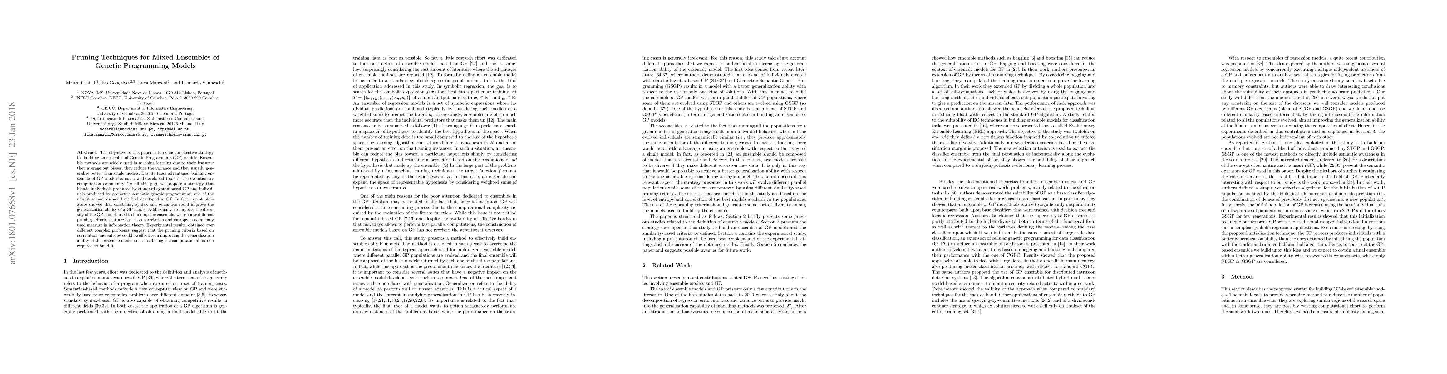 The objective of this paper is to define an effective strategy for building an ensemble of Genetic Programming (GP) models. Ensemble methods are widely used in machine learning due to their features: they average out biases, they reduce the variance and they usually generalize better than single models. Despite these advantages, building ensemble of GP models is not a well-developed topic in the evolutionary computation community. To fill this gap, we propose a strategy that blends individuals produced by standard syntax-based GP and individuals produced by geometric semantic genetic programming, one of the newest semantics-based method developed in GP. In fact, recent literature showed that combining syntax and semantics could improve the generalization ability of a GP model. Additionally, to improve the diversity of the GP models used to build up the ensemble, we propose different pruning criteria that are based on correlation and entropy, a commonly used measure in information theory. Experimental results,obtained over different complex problems, suggest that the pruning criteria based on correlation and entropy could be effective in improving the generalization ability of the ensemble model and in reducing the computational burden required to build it.
