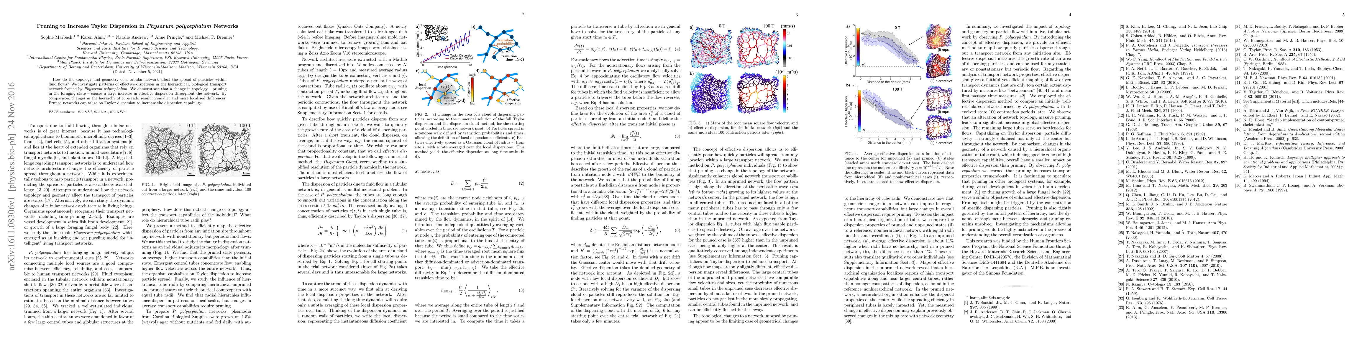 How do the topology and geometry of a tubular network affect the spread of particles within fluid flows? We investigate patterns of effective dispersion in the hierarchical, biological transport network formed by Physarum polycephalum. We demonstrate that a change in topology - pruning in the foraging state - causes a large increase in effective dispersion throughout the network. By comparison, changes in the hierarchy of tube radii result in smaller and more localized differences. Pruned networks capitalize on Taylor dispersion to increase the dispersion capability.
