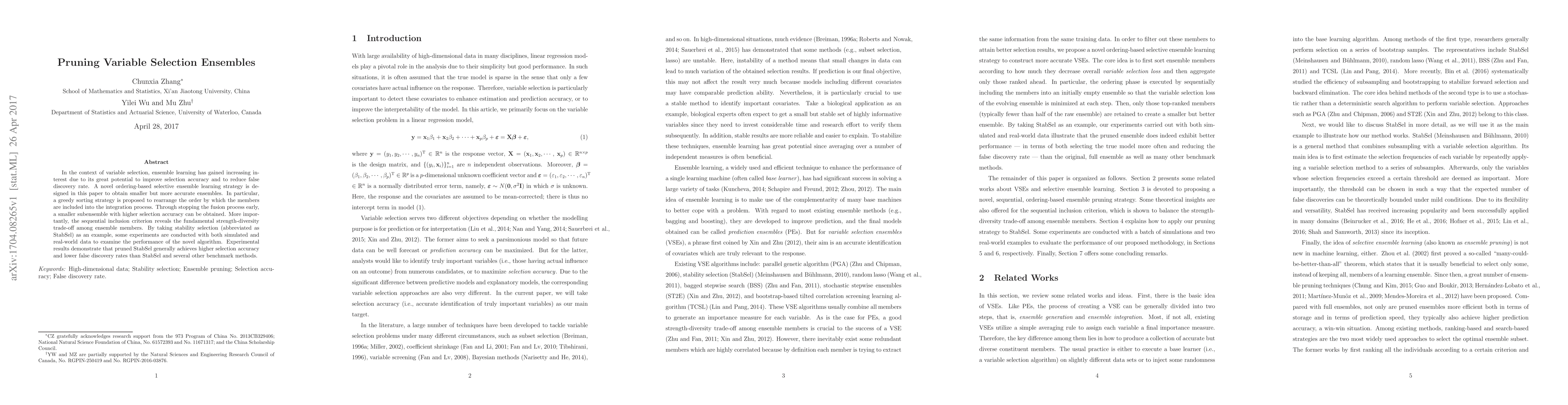 This paper introduces a novel ordering-based selective ensemble learning strategy to create smaller, more accurate ensembles by employing a greedy sorting method to optimize member inclusion. Experiments with stability selection on simulated and real-world data show that the pruned ensemble achieves higher selection accuracy and lower false discovery rates.